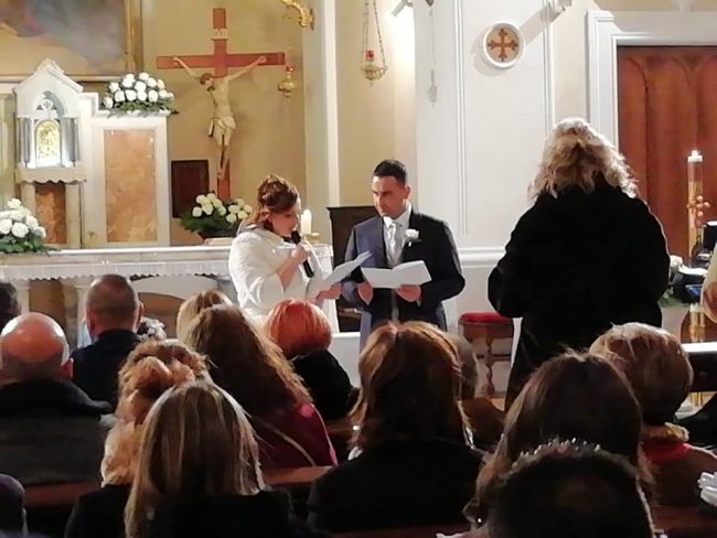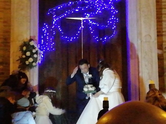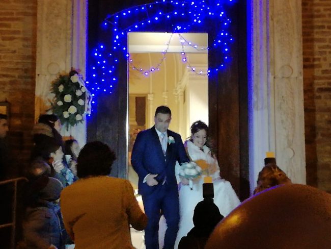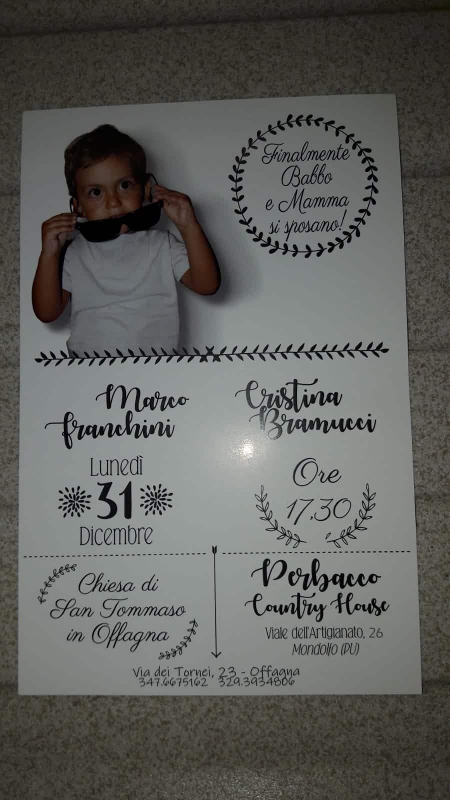 Il cenone di San Silvestro che si trasforma nella cena di nozze. Il brindisi con lo spumante che racchiude l’augurio di proseguire una vita felice e insieme ben oltre il 2019 ma anche quello di Capodanno e di un compleanno indimenticabili. E’ stata una festa all’ennesima potenza quella che hanno organizzata ieri, per amici e parenti, l’osimano Marco Franchini, 36 anni, e l’offagnese Cristina Bramucci di 34. La coppia che ha già un bambino, Leonardo, si è unita in matrimonio ieri pomeriggio nella chiesa di San Tommaso ad Offagna e la data non è stata scelta a caso. Il 31 dicembre oltre ad essere il capolinea del 2018 era anche il giorno del compleanno della sposa, molto conosciuta nel borgo medievale perché con la sorella Serena ed il fratello Raffaele è proprietaria del bar ‘Dalle Donzelle’. Dopo la consegna delle fedi da parte di un paggetto, il piccolo Leonardo, e una damigella, la nipotina Gemma, molto speciali, dopo la pronuncia del fatidico sì davanti al sacerdote e il lancio del riso all’uscita della chiesa, gli sposi ed i circa 200 ospiti, tutti elegantissimi, sono partiti a bordo di diversi autobus noleggiati per l’occasione, per il Country House ‘Perbacco’ di Mondolfo. E qui è iniziata la no stop di divertimento animata fino alle 4.30 di stamattina da Paolo Tittarelli e dalla sua band. Cristina e Marco hanno condito con un pizzico di originalità anche i segnaposti sistemando sui tavoli piccoli dischi in vinile con i nomi di ciascun commensale e le bomboniere, un paio di occhiali da sole ispirati al cult movie “The Blues Brothers”. Gli stessi che indossava Leonardo nella foto del biglietto di invito per annunciare il matrimonio dei suoi genitori.