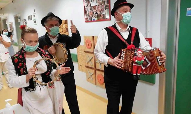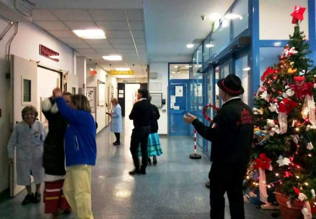 Musica, allegria e giocattoli per i bimbi ricoverati all’ospedale pediatrico Salesi di Ancona. L’associazione culturale Li Matti de Montecò ha fatto visita ai piccoli ricoverati lo scorso 4 gennaio. A esibirsi l’insegnante Monia Scocco ed altri membri del gruppo folkloristico che hanno cercato di strappare un sorriso ai bimbi del reparto di Oncoematologia del Salesi, suonando nei corridoi. Hanno portato allegria ai bambini, alle famiglie ed anche ai medici ed infermieri e un augurio di buona guarigione con il rituale canto della Pasquella. Ma oltre ai sorrisi il gruppo ha portato anche sei scatoloni di giochi e libri che sono stati raccolti per essere donati dagli alunni delle scuole primarie di Potenza Picena e di Montecosaro, oltre che dalla scuola d’infanzia di viale della Vittoria di Montecosaro Alto (dove l’associazione ha realizzato i progetti di diffusione sulle tradizioni popolari marchigiane). «Ci portiamo nel nostro cuore i loro sorrisi, le loro parole, i loro gesti – ha detto Monia Scocco – sono emozioni che ci aiutano a riflettere e ci insegnano molto. Siamo convinti che la musica è vita, è qualcosa che accomuna tutti i bambini, anche chi purtroppo è meno fortunato di noi».