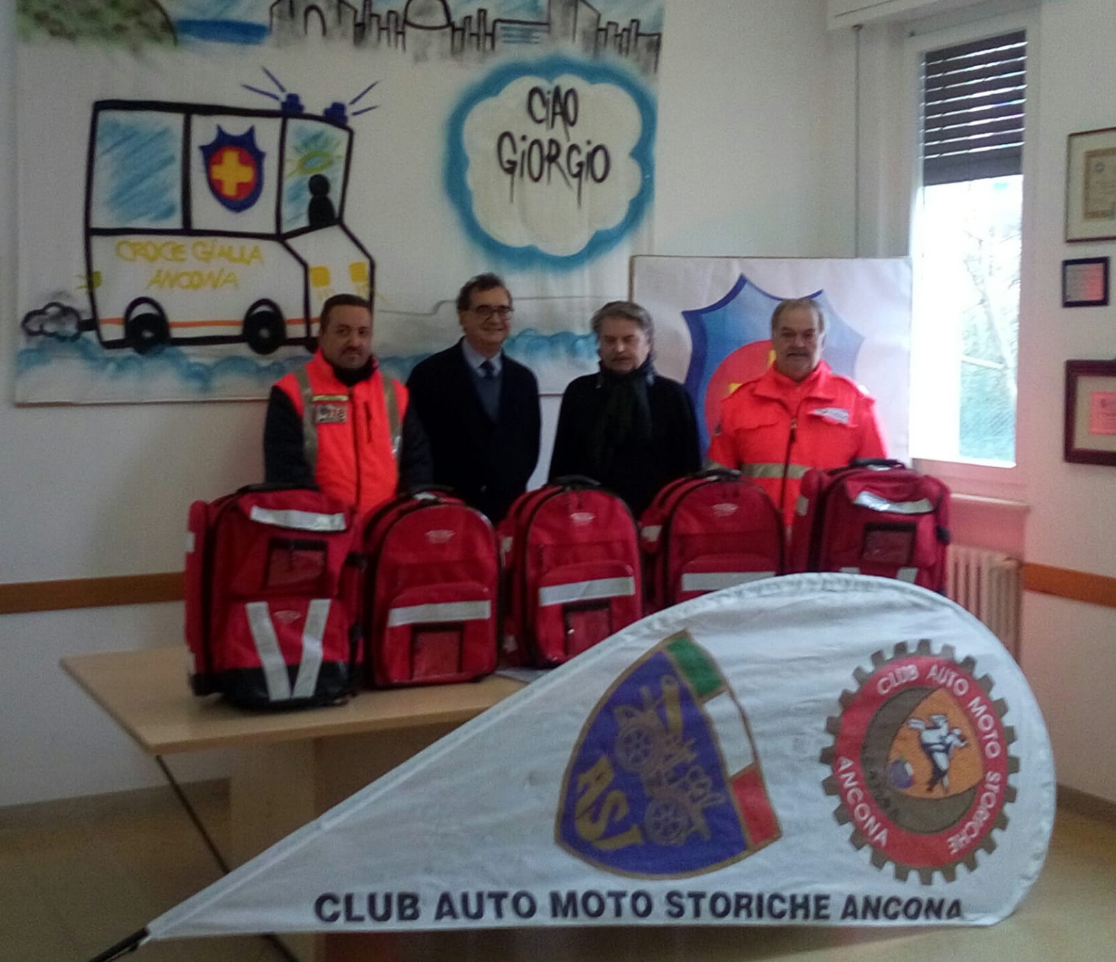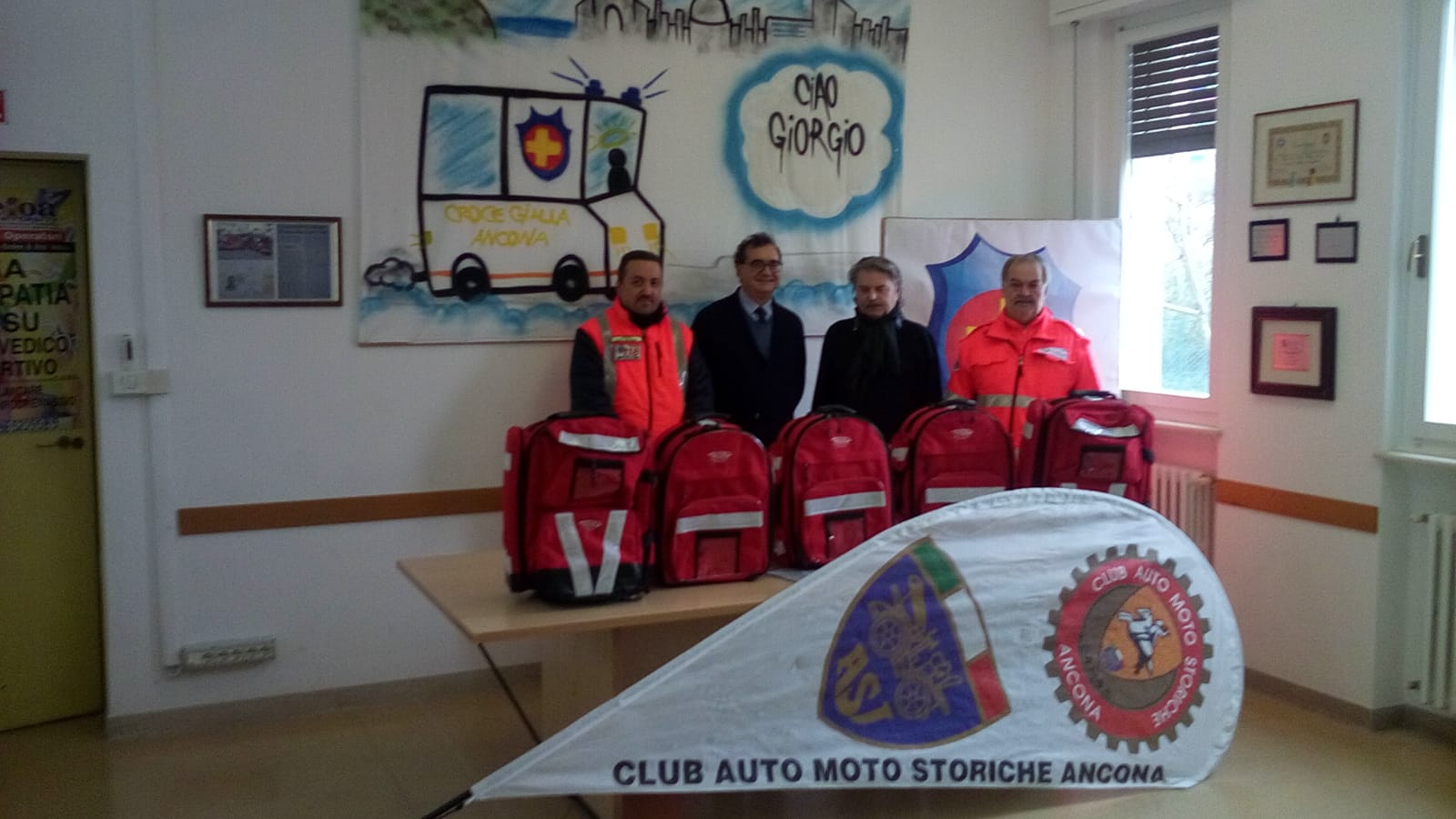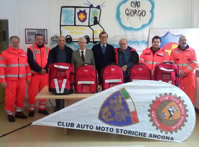 Una nuova donazione per la Croce Gialla di Ancona. Stamattina nella sede dell’associazione socio-saniatria il club Auto e moto storiche di Ancona ha consegnato ai volontari 5 borsoni che verranno utilizzati nei mezzi in servizio 118 e quelli impiegati nelle varie manifestazioni dove la Croce Gialla presta assistenza. Il materiale è stato acquistato grazie ad una raccolta fondi promossa dallo stesso club motoristico. Alla consegna del materiale era presente Franco Casamassima presidente del club, i consiglieri Ennio Duranti, Luigi Cafasi e Rideo Palazzo mentre per la Croce Gialla ha fatto gli onori di casa Sauro Giovagnoli, direttore di sede. Per quello che riguarda il club il presidente ha confermato una serie di eventi che verranno organizzati in collaborazione con la Croce Gialla di Ancona.