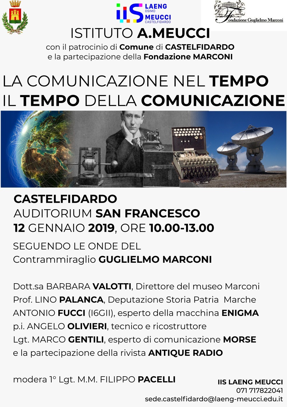 “La comunicazione nel tempo” è il tema che l’Istituto A. Meucci di Castelfidardo (IIS Laeng Meucci) sviluppa sabato in Auditorium San Francesco dalle 10.15. Seguendo le orme del contrammiraglio Guglielmo Marconi, il convegno patrocinato dal Comune di Castelfidardo vede la partecipazione della Fondazione Guglielmo Marconi, della rivista Antique Radio e di prestigiosi ospiti e relatori, tra cui Barbara Valotti, direttrice della Fondazione Marconi che ha sede a Pontecchio Marconi, alle porte di Bologna, nella storica Villa Griffone ove l’inventore mise a punto il sistema di telegrafia senza fili che poi si diffuse in tutto il mondo.