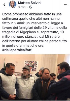 «Come promesso -afferma Salvini- abbiamo fatto in una settimana quello che altri non hanno fatto in due anni – afferma il ministro – un intervento di legge a favore dei familiari delle 29 vittime della tragedia di Rigopiano e, soprattutto, 10 milioni stanziati dal ministero dell’Interno per aiutare chi ha perso tutto in quelle drammatiche ore. Dalle parole ai fatti». Va avanti, intanto, l’inchiesta bis sul disastro dell’hotel. Giovedì prossimo (17 gennaio) saranno interrogati i sette indagati accusati di frode in processo penale e depistaggio.