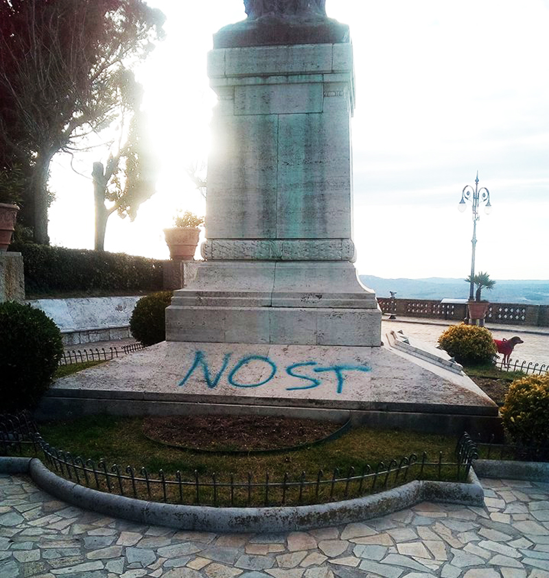 Negli ultimi anni l’area verde di Piazza Nuova, i giardini storici di Osimo, è stata teatro di atti vandalici, l’ultimo dei quali scoperto proprio stamattina. Qualcuno armato di bomboletta spray ha imbrattato con una scritta misteriosa (‘Nost’) il basamento in marmo del monumento ai caduti di tutte le guerre, inaugurato sul belvedere nel 1925. Un gesto arbitrario e immotivato che allunga l’elenco dei danneggiamenti consumati in questo scorcio di città, tra i più belli di Osimo: dai grossi vasi artistici, scaraventati a terra e mandati in frantumi, al furto delle begonie durante il restyling dell’area verde e alla devastazione avvenuta nella casa del custode che un tempo ospitava il laboratorio intitolato ‘Il Cantiere dei Talenti’. Sulla passeggiata di via Saffi, a pochi metri di distanza dalla caserma dei carabinieri, sono però accese le telecamere comunali che potrebbero aver ripreso qualche movimento sospetto.
