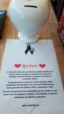 Giovanni Mezzopera di Coldellanoce ed altri concittadini hanno infatti organizzata una colletta che proseguirà fino al prossimo 20 gennaio.I negozi dove si può contribuire alla raccolta per la famiglia della piccola Beatrice sono: il Bar Sottosopra, il Bar del Castello, il Bar Pub Pispy, l’edicola Il Maestro, i supermercati Tigre, Sigma, Hurra, Coal, il bar Bartolucci, il Baretto, La Criccca Monterosso,Non solo Bimbi, Michele Agostinelli Calzature, Foto Ottica Ciocci, il bar Picnic Colleponi, il bar Cristallini. Le somme raccolte nei salvadanai saranno ritirate domenica prossima per essere consegnate ai genitori e al fratellino di Beatrice.