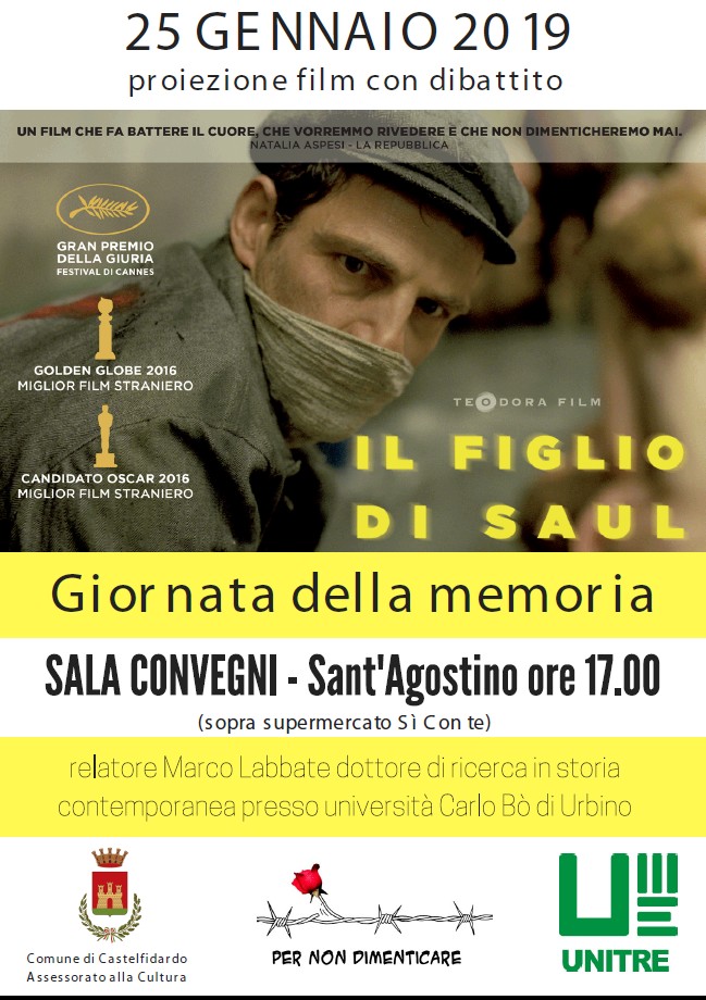 Il Comune di Castelfidardo – assessorato alla Cultura in collaborazione con l`Unitre, Università delle Tre Età – celebra la Giornata della memoria con la proiezione del cortometraggio “Il figlio di Saul”, pellicola d`esordio del regista ungherese László Nemes che si è aggiudicato fra l`altro il premio Oscar e un Golden Globe come migliore film straniero. La proiezione con ingresso libero e aperto a tutta la cittadinanza, si svolge venerdì 25 gennaio alle 17 presso la nuova sala convegni di piazza Sant`Agostino (sopra il supermercato Sì con Te). La visione sarà seguita dal dibattito alimentato dal relatore Marco Labbate, dottore di ricerca in storia contemporanea presso l`Università Carlo Bò di Urbino, collaboratore dell`”Istituto Storia Marche” e dell`Istituto di storia contemporanea del Comune di Pesaro e di alcune riviste a tema storico.