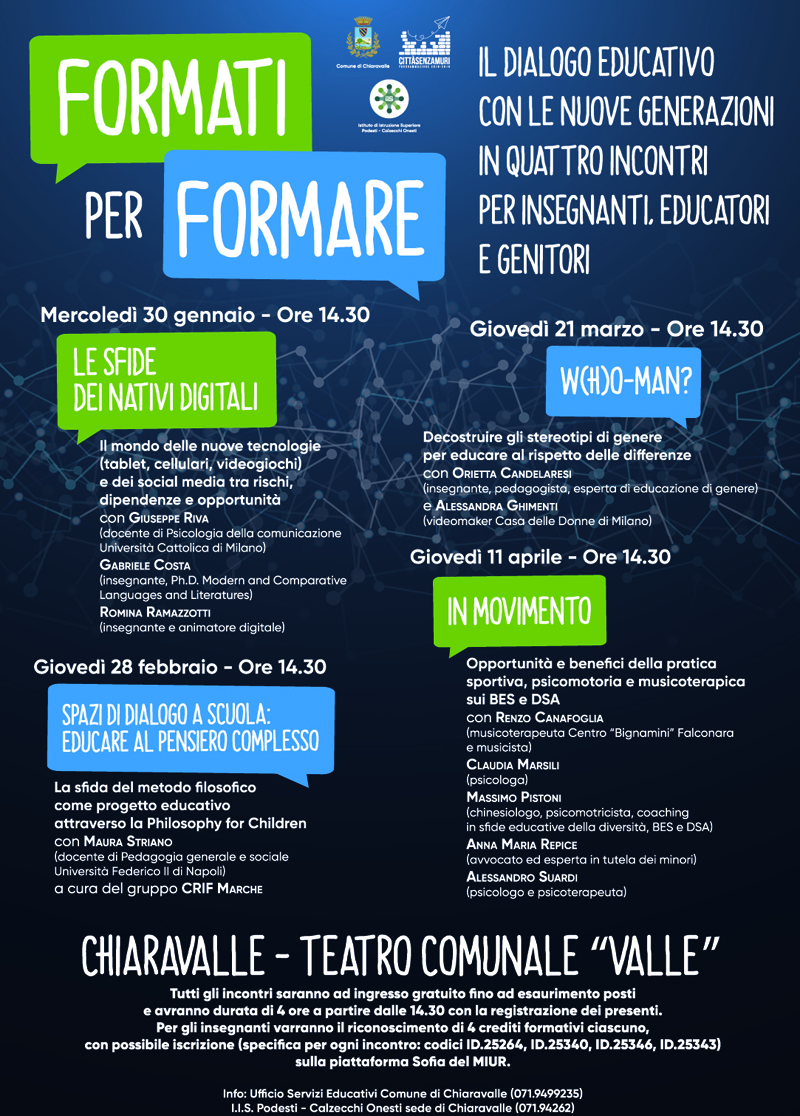 Mercoledì 30 gennaio, alle ore 14.30, presso il Teatro Comunale “Valle” prenderà il via “Formati per formare”, un ciclo promosso dal Comune di Chiaravalle in collaborazione con l’Istituto di Istruzione Superiore “Podesti – Calzecchi Onesti” (sede di Chiaravalle) e rivolto ad insegnanti, educatori e genitori. L’iniziativa, dedicata al dialogo educativo con le nuove generazioni e tenuta da esperti del settore, si articolerà in quattro incontri incentrati su altrettanti temi: le sfide dei nativi digitali (30 gennaio), il progetto educativo della Philosophy for Children (28 febbraio), la decostruzione dei pregiudizi e degli stereotipi di genere (21 marzo), i benefici dello sport e della musica sui BES e sui DSA (11 aprile).