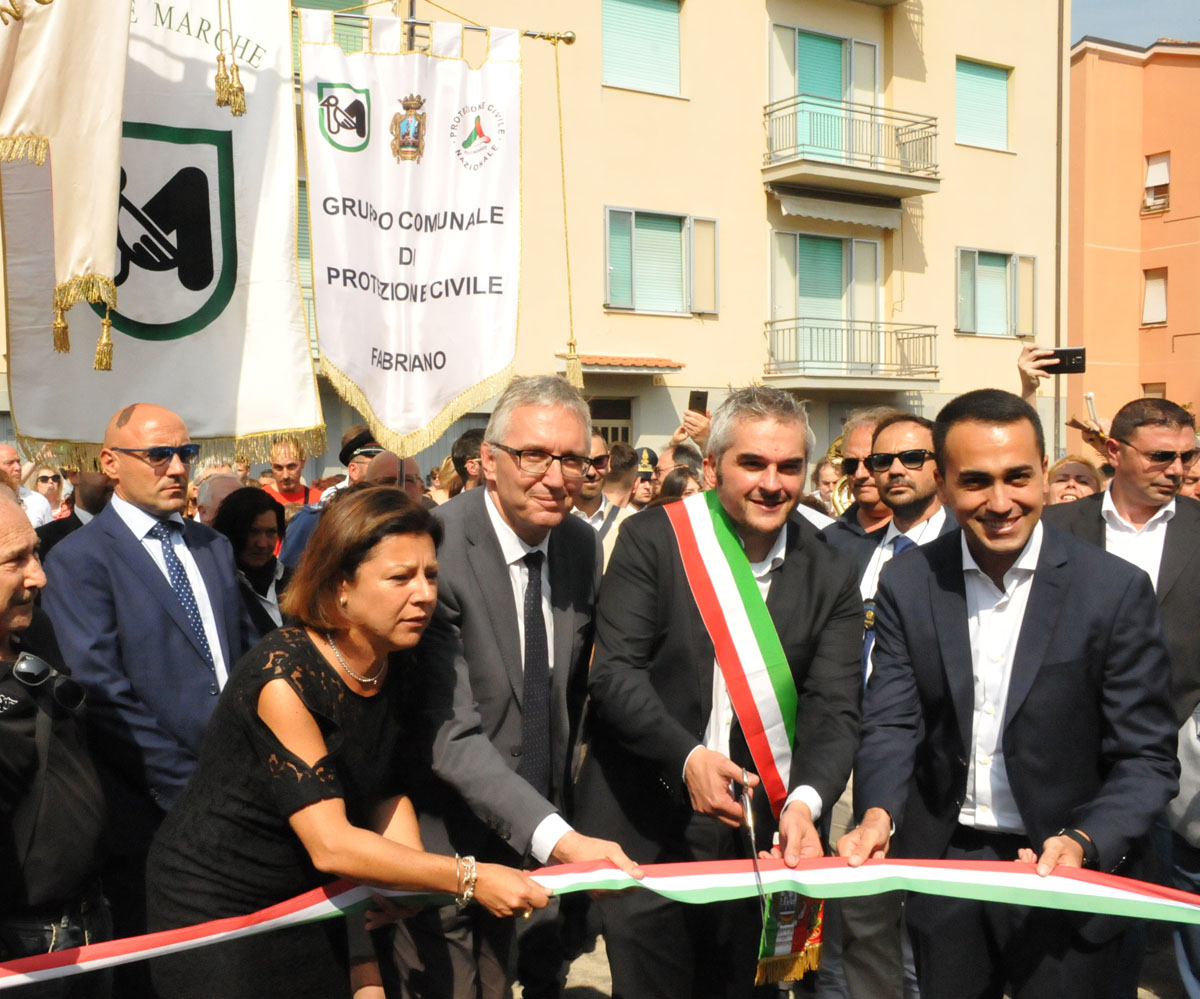 Il sindaco Santarelli (con la fascia tricolore) accanto al governatore Ceriscioli all’inaugurazione della scuola Don Petruio, ricostruita dopo il sisma