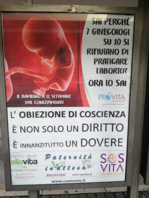 ANCONA – Il movimento si scaglia contro i manifesti di ProVita affissi alle fermate degli autobus ed in giro per la città, che rivendicano l'obiezione di coscienza dei medici come un dovere. «Sette ginecologi su dieci sono antiabortisti: in un paese civile non dovrebbe essercene nemmeno uno in tutto il sistema sanitario»