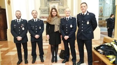 L’assessore Gatto con gli agenti della Polizia locale di Osimo premiati a Pesaro alla Festa della Polizia Locale della Marche durante la festa del patrono, San Sebastiano