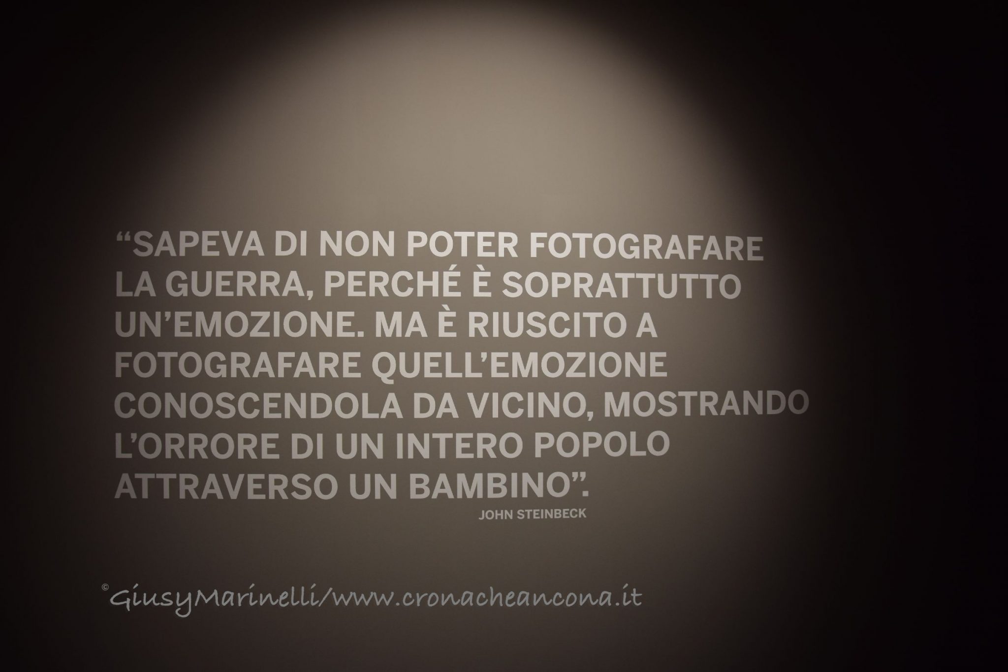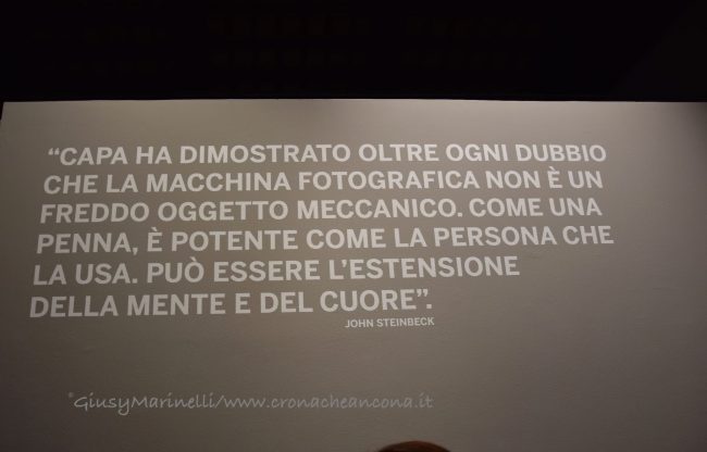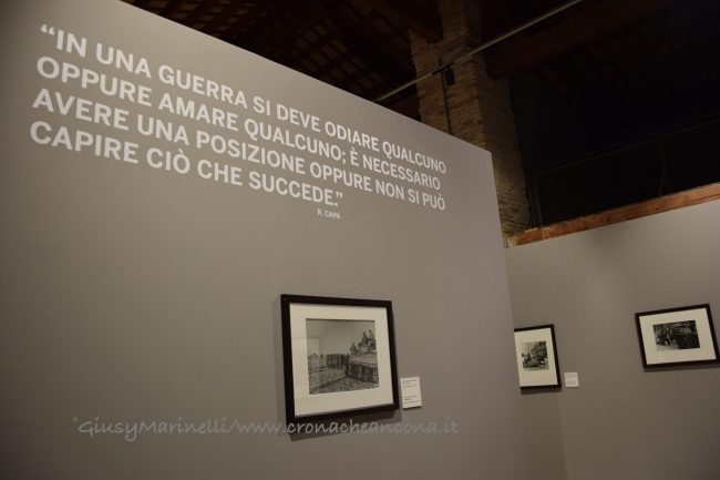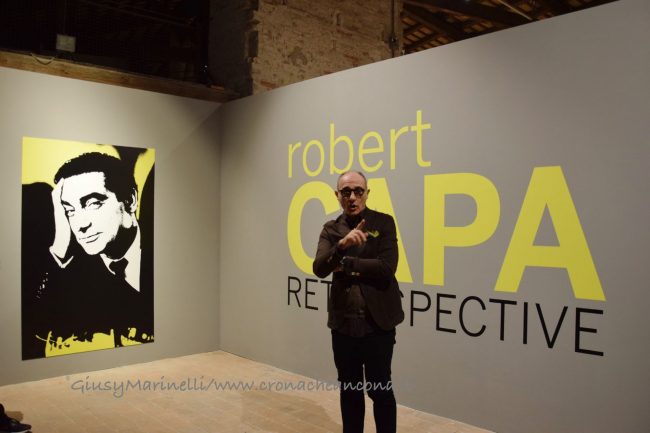«Questa mostra si presta a differenti letture e il visitatore potrà decidere su quale orientare la propria attenzione: la storia recente, le guerre, le passioni, gli amici. Questo perché per Robert Capa la fotografia era un fatto fisico e mentale allo stesso tempo. Una questione politica, ma anche sentimentale. “Se le tue fotografie non sono buone, vuol dire che non sei abbastanza vicino”. Questo il suo mantra e questa la frase scelta da Magnum Photos, per festeggiare i settant’anni dell’agenzia», afferma Denis Curti curatore di mostra, che ha ripreso fedelmente l’esposizione originariamente curata da Richard Whelan. «Se la tendenza della guerra – osserva lo stesso Whelan, biografo e studioso di Capa – è quella di disumanizzare, la strategia di Capa fu quella di ri-personalizzare la guerra registrando singoli gesti ed espressioni del viso. Come scrisse il suo amico John Steinbeck, Capa “sapeva di non poter fotografare la guerra, perché è soprattutto un’emozione. Ma è riuscito a fotografare quell’emozione conoscendola da vicino, mostrando l’orrore di un intero popolo attraverso un bambino».