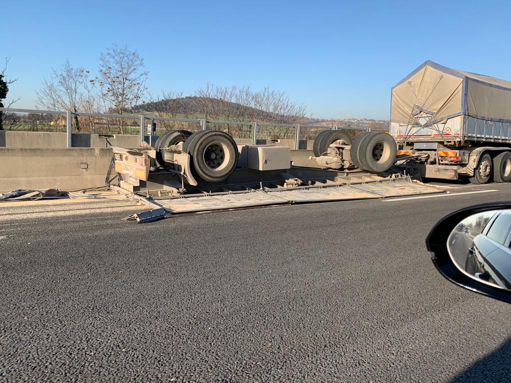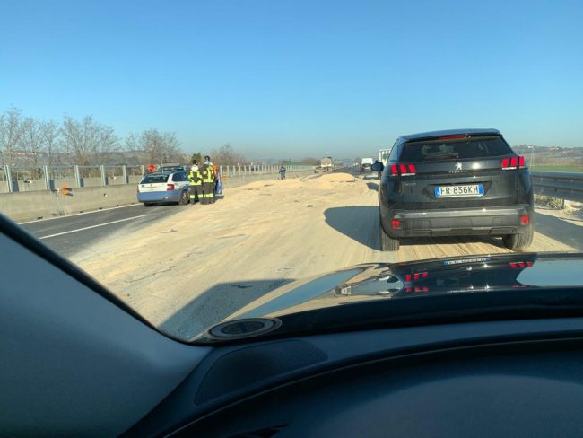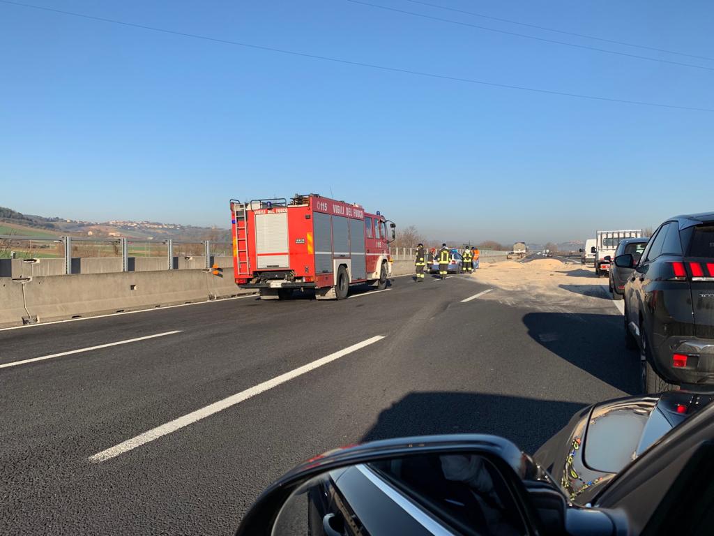 Il materiale farinaceo fuoriuscito dal semirimorchio ha ostruito circa 150 metri quadri di carreggiata. Il traffico ha subito forti rallentamenti per tutta la mattinata ed è stato fatto defluire su un’unica corsia di marcia fino a verso le 12.30 quando l’asfalto è stato del tutto bonificato e liberato dei detriti. I vigili del fuoco hanno messo in sicurezza lo scenario dell’incidente. La auto coinvolte nello scontro sono una Opel Mokka, una Opel Insigna e una Bmw 320. La coppia estratta dall’Opel Mokka è stata trasferita all’ospedale regionale non in gravi condizioni. La vettura era guidata da un 49enne di Androloco (Rieti) . Sul posto sono intervenute due squadre dei vigili del fuoco del distaccamento di Osimo e una pattuglia della Polizia autostradale di Porto San Giorgio, oltre al 118 e all’eliambulanza.