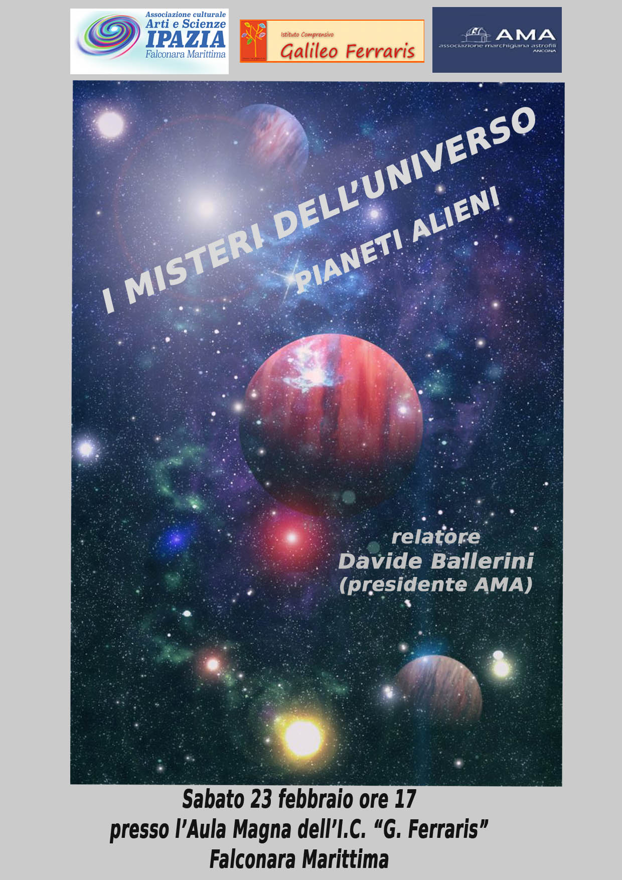 “Ballerini ci porterà in un viaggio tra lontani Pianeti Alieni (esopianeti) nel grande universo ancora pieno di misteri, e con video ed illustrazioni interessanti ci spiegherà di come la vita aliena si può trovare nello spazio infinito, ma può esistere anche molto vicino a noi – E questa e Scienza, non fantascienza “- spiega Mirela Cisman la presidente dell’associazione IPAZIA, e continua – “Abbiamo una bella e consolidata collaborazione con l’I.C.”G. Ferraris” e con la dirigente dell’ Istituto Prof. Maria Ambrogini, che ci mette a disposizione l’aula Magna e le sue dotazioni tecniche per promuovere iniziative di grande interesse per i giovani”.