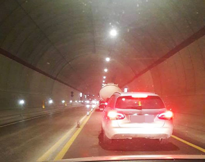 Mezzi incolonnati sotto la galleria Valtreara, oggi pomeriggio, per un banale tamponamento avvenuto sulla Ss 76 (foto Andrea Rossi)