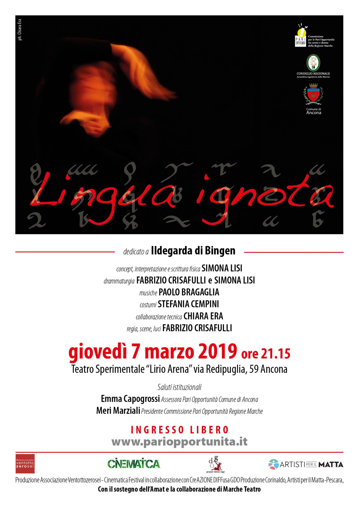 Mistica, veggente, ma anche fine musicista, erborista, guaritrice, una donna che nei tempi bui del Medioevo veniva ascoltata e temuta da papi e imperatori. Un’anteprima nazionale per uno spettacolo intenso e visionario che vede la danzatrice e attrice marchigiana Simona Lisi interpretare una donna che fu capace di parlare con aristocratici e popolani, donne e uomini, con la forza di un linguaggio fortemente simbolico. Dalle note di regia: «Musicista in un periodo nel quale alle donne era interdetta la musica, scrittrice quando alle donne era proibito scrivere, eccezionalmente accreditata dalla Chiesa a predicare, Ildegarda fu l’autrice di una delle prime lingue artificiali di cui si abbiano notizie, la Lingua ignota, da lei utilizzata per fini mistici e forse anche come crittografia diplomatica, con un alfabeto di 23 lettere, con un vocabolario di poco più di mille parole. Religiosa, naturalista, poetessa, musicista e compositrice, filosofa, guaritrice, è un personaggio che affascina per la modernità della sua figura per il suo cogliere le connessioni, le risonanze tra lingue e suoni, concetti e medicamenti, gesti e visioni. E proprio a una sinestesia di suoni, gesti e visioni è affidato il lavoro che si presenta, che nelle trame infinite di connessione tra i diversi linguaggi crea una lingua ignota e misteriosa». I costumi sono di Stefania Cempini e la collaborazione tecnica di Chiara Era. La co-produzione è dal festival Cinematica (Associazione Ventottozerosei) in collaborazione con CreAZIONE DIFFusa GDO Produzione Corinaldo, Artisti per il Matta-Pescara, con la collaborazione del Comune di Recanati, l’Amat e Marche Teatro. Lo spettacolo rientra nell’ambito dei festeggiamenti per l’8 marzo ed è un evento sostenuto dalla Commissione Pari Opportunità della Regione Marche e dall’Assessorato Pari Opportunità del Comune di Ancona. Ingresso gratuito.