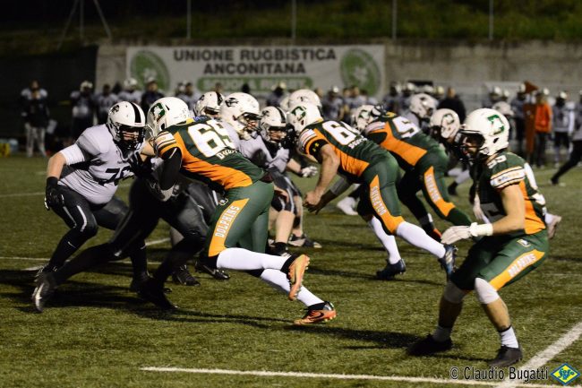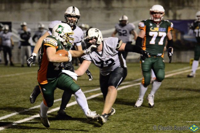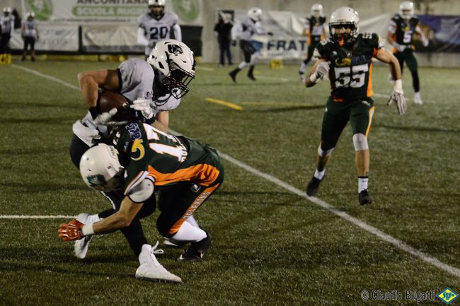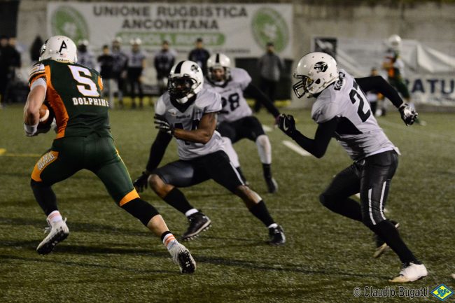 L’attacco di Parma macina yard su yard e appare inarrestabile guidato da Reilly Hennessey che sfrutta nei lanci Michele Canali e Vincenzo Ferraro e nelle corse Alessandro Malpeli Avalli. Ma giunti a poche yard dal touchdown, quando tutto sembrava compromesso per i Dolphins, il regista delle pantere cincischia e si crea un fumble che la difesa dorica recupera. Touchback. Si riparte dalle 20 yard e Hughes, lancio dopo lancio manda Dylan Albertson in touchdown e, con il successivo extra point trasformato da Cristiano Brancaccio si va in vantaggio per 7-0. Un drive per uno risulta inutile finchè la palla non torna ai Panthers che fanno 7 a 7 con un calcio di Teo Felli. Partita molto bella, fluida, che scorre via tra l’entusiasmo dei presenti senza particolari momenti di noia, tanto che al termine di una lunghissima azione i Dolphins vanno in vantaggio 10-7 grazie ad un field goal di Brancaccio. Sfortunatamente per i dorici, però, il successivo drive dei Panthers si conclude alla stessa maniera del precedente: corsa in end zone di Malpeli Avalli e trasformazione di Felli per il 10-14 che chiude così il primo tempo e che, come detto, reggerà fino allo scadere. I successivi due tempi restanti decretano la solidità di entrambe le difese, capaci di non concedere neanche più un punto ai rispettivi attacchi avversari; per i Dolphins segnaliamo un bell’intercetto del giovane Kristian Giardinieri. Un azione finale dei dorici riesce ad arrivare a poco più di 20 yard dalla end zone nemica ma un fallo di Filippo Lombardi annulla l’azione dei Dolphins e anzi li costringe a partire 15 yard più indietro come penalità.