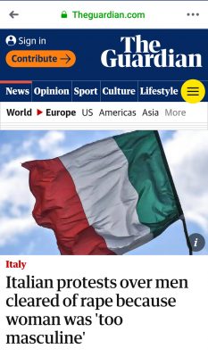 Rimbalza sulle pagine del ‘The Guardian’ La vicenda della sentenza choc pronunciata dalla Corte d’Appello di Ancona sullo stupro della ragazza ‘troppo mascolina’ per essere attrattiva. Il quotidiano inglese in versione on line riporta la notizia dei 200 partecipanti alla manifestazione di protesta che ieri mattina si è svolta nel capoluogo di regione, insieme alle parole di Cinzia Molinaro, avvocato della donna, e di Luisa Rizzitelli portavoce di Rebel Network, il gruppo femminile che ha organizzato il flash mob di Ancona, e che “….ha definito ‘medievale’ il verdetto dei giudici…” scrive il giornale.”La cosa peggiore è il messaggio culturale che è arrivato da tre giudici donne che hanno assolto questi due uomini perché hanno deciso che era improbabile che volessero violentare qualcuno che sembrava maschile – ha dichiarato Luisa Rizzitelli al Guardian – È vergognoso”. Ma ottenere quasi 200 persone alla protesta è stato un miracolo per l’Italia, per fortuna, dimostra che la sensibilità verso questi temi si sta rafforzando”.