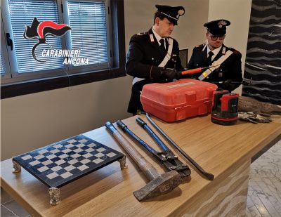 Dai primi accertamenti è risultato che il veicolo era stato rubato poco prima dal parcheggio di una ditta del posto, insieme a del denaro trafugato dai distributori automatici di bevande. Inoltre all’interno dell’abitacolo è stata rinvenuta refurtiva varia, asportata in un’altra azienda, composta da una livella laser 3D, un soprammobile a forma di coccodrillo, una scacchiera in pietra di marmo, attrezzi atti allo scasso, in particolare una grossa cesoia, una mazza per l’edilizia ed un piede di porco. La refurtiva è stata restituita alle vittime dei furti. I servizi preventivi potenziati nell’area a sud di Ancona, che si inquadrano in una più ampia attività disposta dal Comando Provinciale di Ancona per arginare i reati predatori, continueranno nei prossimi giorni.