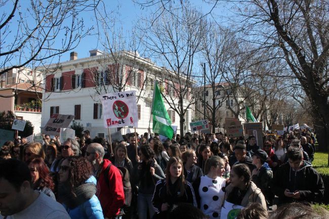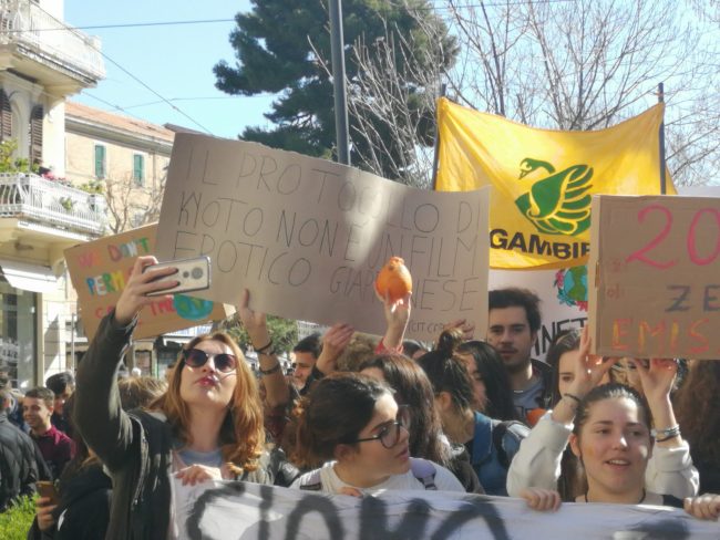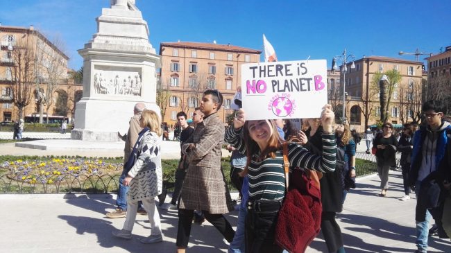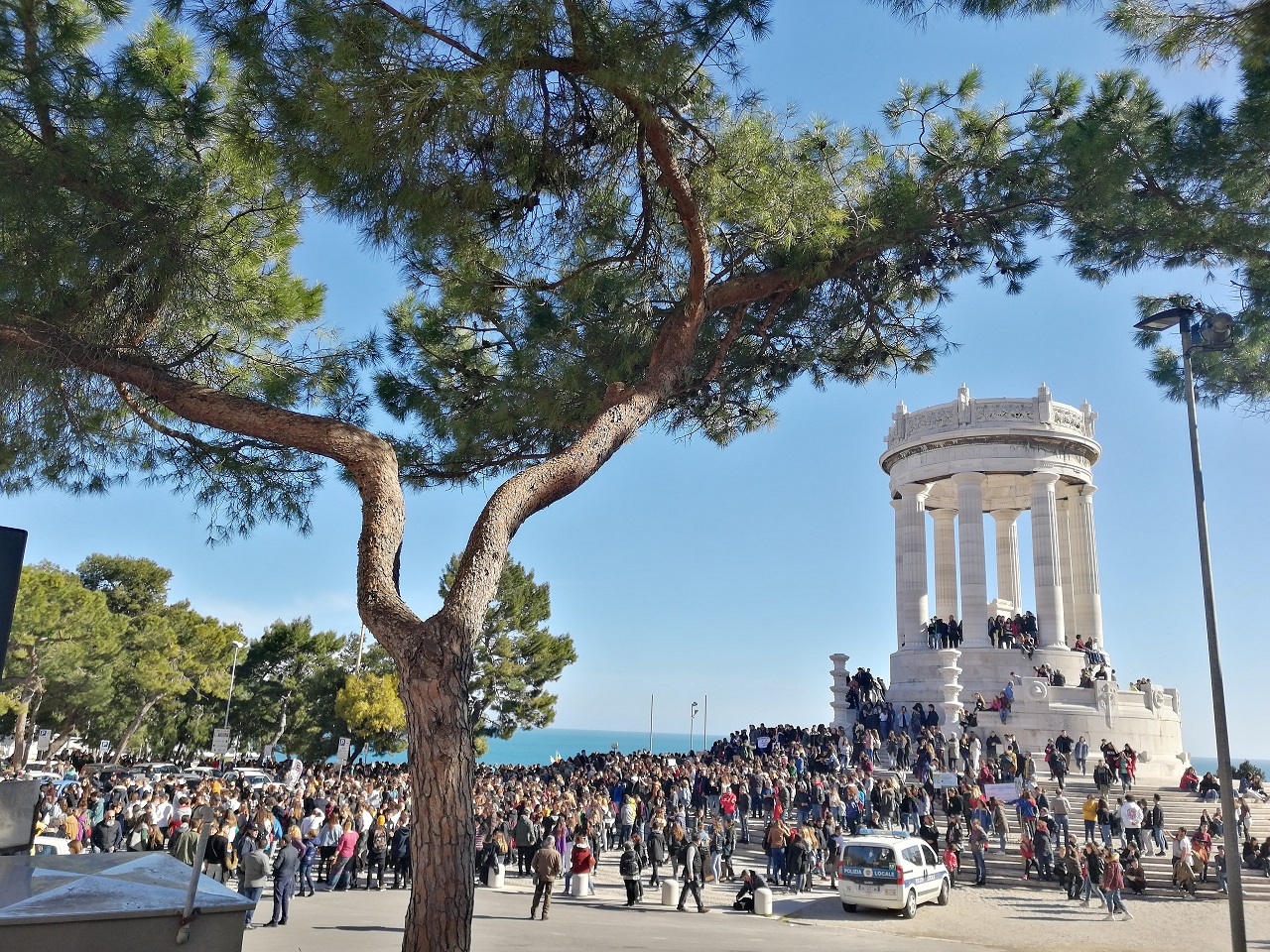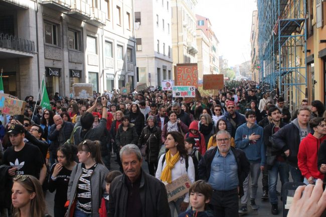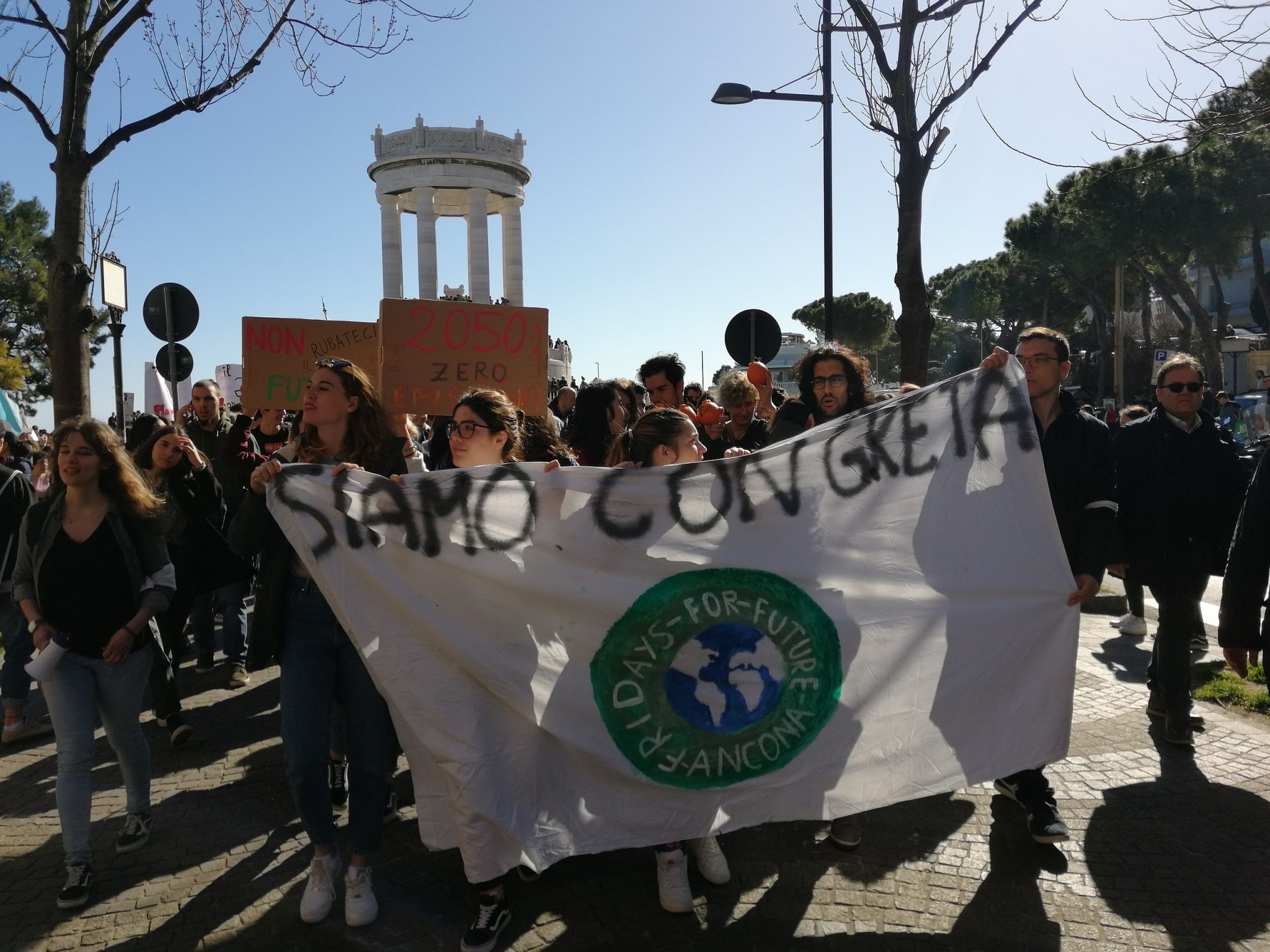 Non si ricordava una manifestazione così partecipata da anni per le vie della città. Il Global Climate Strike – Ancona ha richiamato tanti di quei giovani da lasciare sorpresi anche i più ottimisti. Oltre 4mila persone secondo gli organizzatori, comunque più di 3mila per la polizia. Ragazzi delle scuole superiori e delle università, persino delle primarie, hanno impugnato cartelli e scandito cori dal Passetto a Piazza Roma, in un corteo convocato a difesa del bene comune per eccellenza, la Terra, il suo clima, il suo ecosistema complesso e fragile, la casa di ognuno di noi e soprattutto di chi è più giovane. Quello di Ancona, come noto, non è stato un evento isolato. Cortei analoghi oggi si sono svolti su scala globale, in 123 paesi, 140 città italiane, con 2052 dimostrazioni nel mondo preparate da giorni, in un tam-tam dilagato dai social media anche alla informazione mainstream, nel segno di un’icona giovanissima, la sedicenne Greta Thunberg che dalla scorsa estate, ogni venerdì, ha iniziato a piazzarsi con un cartello davanti al Parlamento svedese contro il surriscaldamento globale. Raggruppati in hashtag come #FridayForClima #GlobalStrike e #15Marzo, solo nelle Marche si sono dati appuntamento altri giovani a Urbino, Pesaro, Fano, Senigallia, Jesi, Fabriano, Santa Maria Nuova, Cupramontana, Macerata, Camerino, Staffolo. Quella di Ancona è stata la manifestazione più grande, seguita da Macerata, e ha raccolto studenti da tutta la provincia e oltre. Anche le stesse forze dell’ordine hanno dato l’idea di aver sottostimato i numeri. Erano in formazione esigua a scortare il fiume di giovanissimi e giovani, lungo quasi 600 metri. Con gli studenti, hanno sfilato mescolati anche visi più in là con gli anni, fra attivisti di movimenti politici, associazioni e comitati, rappresentanti delle istituzioni, con o senza bandiere in un lungo elenco. La manifestazione è rimasta sostanzialmente apolitica e colorata solo di fantasiosi cartelli e cori, soprattutto alla testa del corteo. «Siamo qui per informare, e non per protestate», si è più volte scandito al megafono, e poi «Come si diceva una volta, dobbiamo agire dal basso, non lasciarci vivere». Fra i cori: «Chi non salta indifferente è», «Ci avete rotto il clima», «Ridateci il futuro» e cartelli “Make the Earth Great Again”, “L’amore è nell’aria ma l’aria è sporca”. Sirio Papa, studente universitario ed uno dei coordinatori, spiega: «È nato tutto in internet, si è creata una rete di contatti. Non c’è un comitato centrale ma ogni città è rimasta libera di organizzarsi come credeva». In una piazza Roma affollatissima, con tanto di mercato nonostante la manifestazione e la ristrettezza di spazio, hanno chiuso la giornata gli interventi di due docenti dell’Università di Urbino, Michela Maione e Giovanni Marin. Entrambi, in una lezione a cielo aperto, hanno parlato dei rischi che il nostro mondo sta vivendo, dell’importanza degli accordi climatici, e quindi del futuro della platea di giovani seduti ad ascoltare, sotto un sole troppo caldo per essere marzo ma di risveglio delle coscienze.