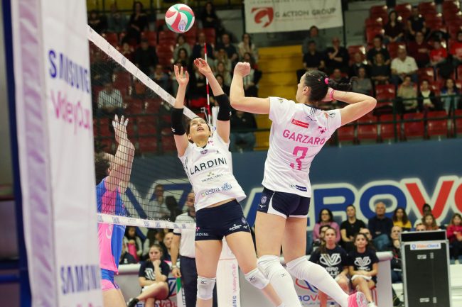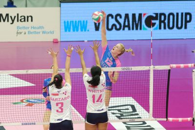 La Lardini parte bene, ma non riesce a capitalizzare una buona prestazione, perdendo 3-1 sul campo di una Saugella Monza più lucida e incisiva nei finali di set. Le padrone di casa conquistano il primo break (3-1), ma è l’ex Partenio a garantire l’immediata parità (4-4) e (a muro) il primo vantaggio della Lardini (5-6). Monza sfrutta le fast di Adams, Filottrano trova punti al centro (Garzaro) e con Whitney in un avvio di gara che resta a lungo equilibrato. La Lardini lavora bene in ricezione, Vasilantonaki e Cogliandro la tengono avanti (11-12), ma il primo vero allungo lo confeziona Partenio: il suo mani out apre il break che la stessa Partenio costruisce al servizio, dando modo a Garzaro di piazzare lo slash vincente e poi piazzando l’ace del 13-17. Adams prova a rispondere con la stessa arma (13-15), sul set piomba Vasilantonaki e la Lardini fugge via (17-23), sostenuta da un fantasmagorico 62% in attacco e da una super Partenio (6 punti con l’80%). Ortolani (7 punti e il 70%) annulla il primo di 6 set-point, il servizio out di Bianchini consegna l’1-0 alla Lardini. La Saugella risponde immediatamente (4-0) in un secondo set in costante altalena.