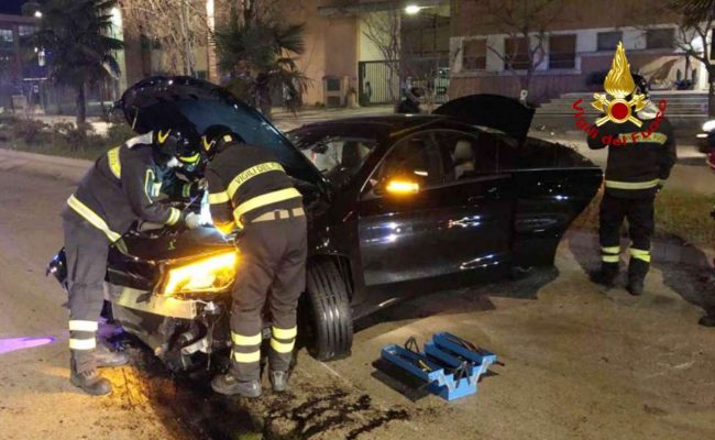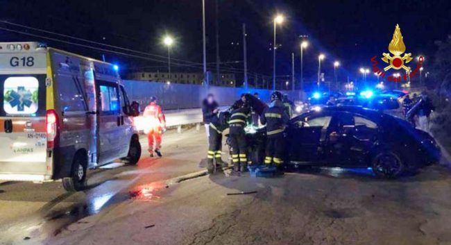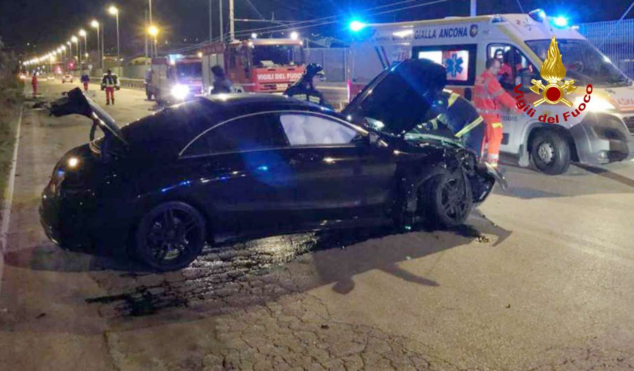 Ha perso il controllo del suv che guidava e il mezzo è finito prima contro il new jersey in cemento, poi è decollato e rimbalzato dall’altra parte della carreggiata. Un volo spettacolare, da film d’azione, quanto spaventoso perchè poteva finire davvero male. Il sabato sera dei 4 giovani che viaggiavano sul Mercedes è terminato all’ospedale. Alle 23 circa di ieri sera, il 118, la Croce Gialla ed i vigili del fuoco sono intervenuti ad Ancona in via Mattei per soccorrere l’automobilista ed i suiu3 amici rimasti coinvolti nell’incidente stradale. Il fuori strada è in fase di ricostruzione da parte della Polizia stradale di Ancona. I vigili del fuoco hanno soccorso il conducente della vettura, un 21enne che è stato trasportato al pronto soccorso dell’ospedale di Torrette con un sospetto trauma facciale dal personale del 118, successivamente hanno messo in sicurezza lo scenario dell’incidente.
