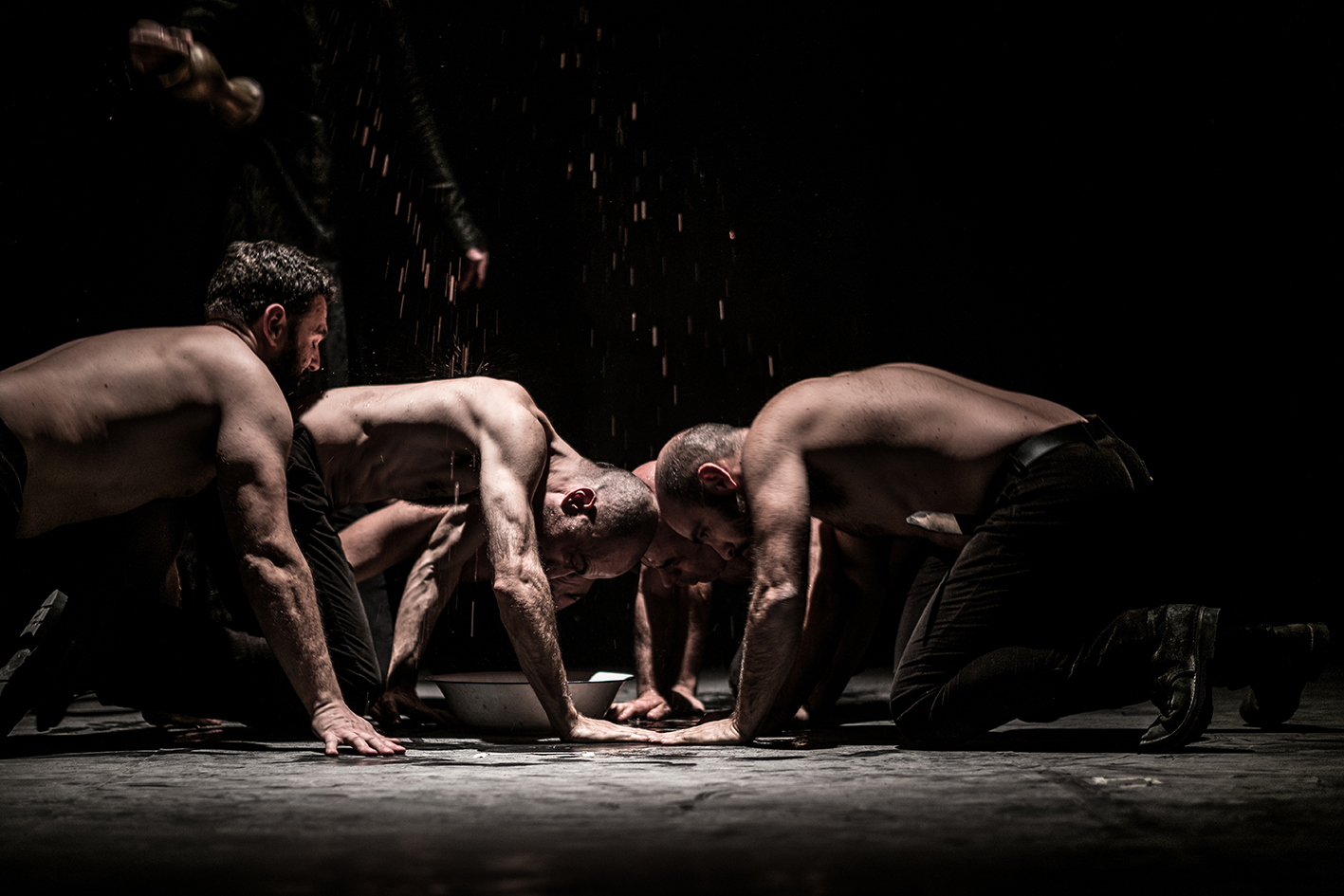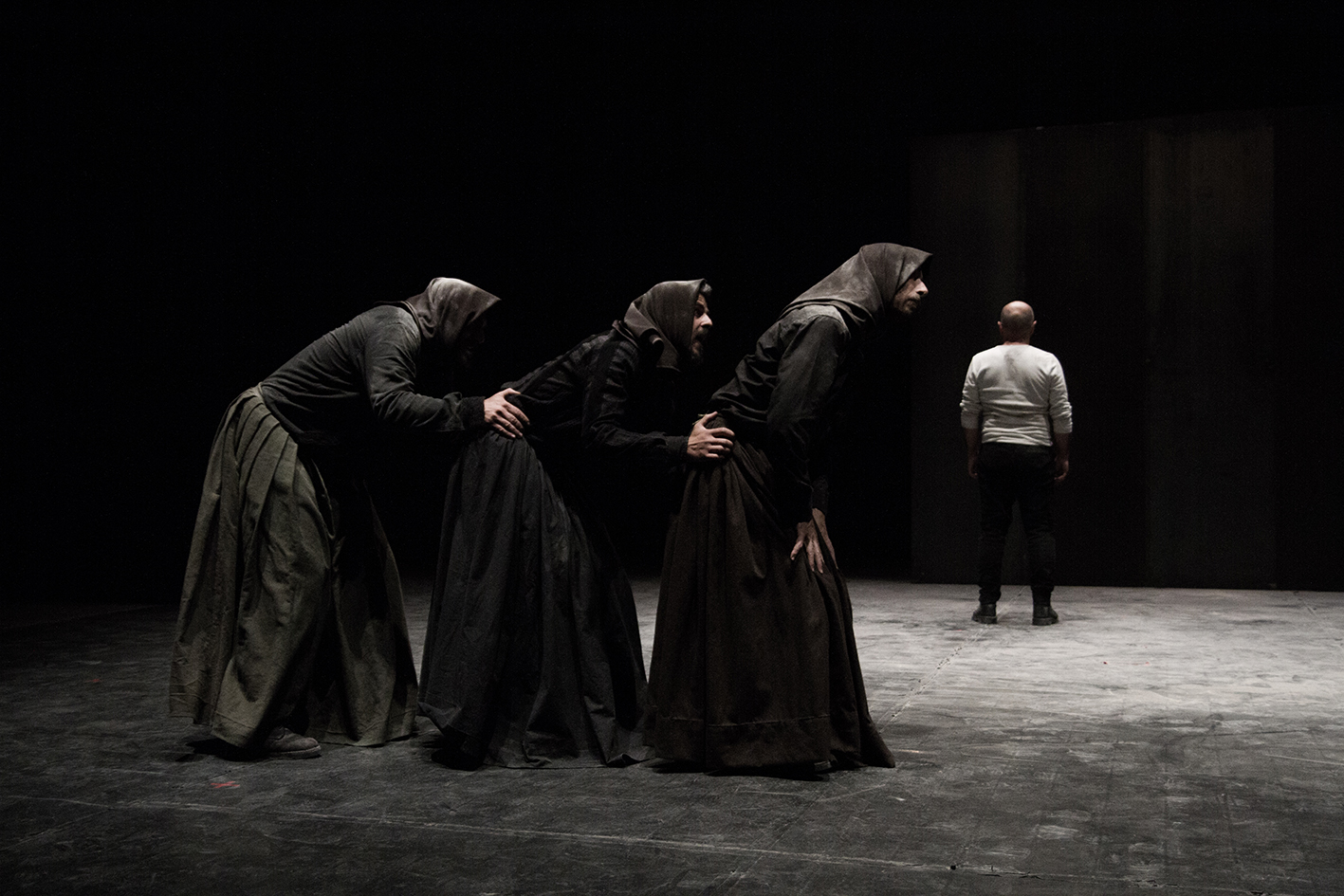 La tragedia della sete di potere che porta alla dannazione dell’anima trova nel Macbettu di Alessandro Serra una rappresentazione plastica di forza violenta e minimale, geometrica e ancestrale. La stessa sprigionata dalle antiche favole ancestrali, o dai racconti dei sabba notturni. Andato in scena al Teatro Pergolesi di Jesi con un grande successo di pubblico, il testo è una riscrittura del Macbeth in tinte agropastorali arcaiche. Con re, generali e baroni shakespeariani tramutati in pastori e contadini, le streghe in vecchiette ingobbite. E il testo tradotto dall’inglese seicentesco del genio di Stratford-upon-Avon in dialetto sardo, sovratitolato per il pubblico. All’unico giorno di programmazione previsto sabato al Pergolesi, Amat ha dovuto aggiungere una replica domenica 17 marzo, tanta è stata la curiosità sollevata dall’opera e la richiesta di biglietti. Macbettu d’altronde ha già abbondantemente superato le centro repliche in giro per il mondo, dall’Europa al Sud America, e si è imposto come uno degli spettacoli teatrali italiani più interessanti degli ultimi anni, acclamato da pubblico e critica e vincitore del prestigioso Premio Ubu 2017 e del Premio Anct 2017 (Associazione Nazionale dei Critici di Teatro). Shakespeare è un autore immortale perché i suoi testi diventano sempre pretesti per esplorare e specchiarsi in storie e immagini viscerali. Ed è quello che Serra ha fatto col il suo Macbettu. Intanto la lingua. L’inglese seicentesco shakespeariano, così denso di echi, spiazzamenti, rimandi, è reso in sardo con la traduzione di Giovanni Carroni e si tramuta in un idioma che ai non autoctoni suona come pura vibrazione, canto amorfo, formula magica che non significa, ma crea azioni. Fatta di urla, bisbigli e sghignazzi.
