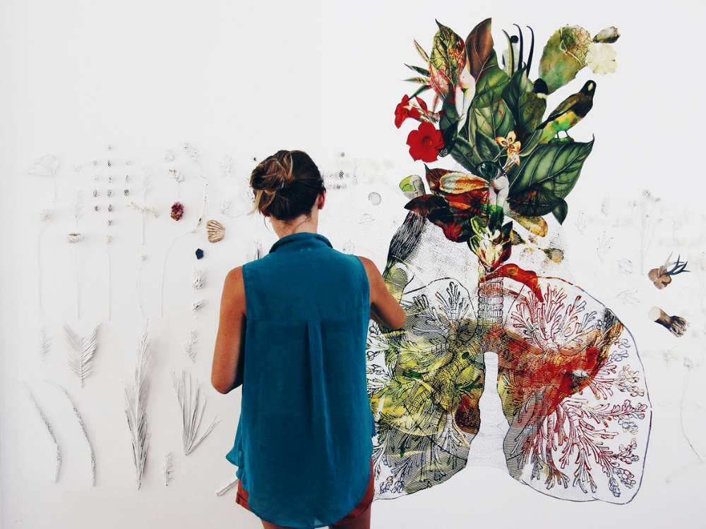 La sua ricerca sperimenta diverse discipline: biologia, botanica, anatomia, archeologia, antropologia, sociologia, psicologia ed architettura; lavora nell’ambito della ricerca del paesaggio sviscerando e associando ad esso l’anatomia umana con diari, disegni, installazioni site-specific, performance, pitture surreali, collage digitali, arte digitale, pittura materica, serigrafia, raccolta, classificazione ed essiccazione di erbe autoctone. La pittura surrealista, i collage, i bozzetti tipografici, le installazioni e la performance corporea sono elementi che fanno coesistere l’organicità, articolandone il coinvolgimento fisico dell’artista che fa del suo corpo veicolo di sperimentazione e terreno di scambio tra l’interiorità e la realtà che la circonda in funzione alla complessità dei contenuti emozionali e simbolici tematizzati. Le sue opere sono interessate a dialogare con la dimensione espressiva degli spazi e in particolare dei contesti territoriali che ha visitato, soprattutto ambiti “locali”, fatti di radici e ramificazioni dei suoi luoghi affettivi. Artista vincitrice nel 2016 del Premio ParatissimaXII presso Torino Esposizioni ha ottenuto prestigiosi riconoscimenti e le è stata dedicata una personale, Exsiccata alla Caserma la Marmora di Torino con successiva esposizione collettiva presso il Mauto (Museo Internazionale dell’automobile). Ha esposto al Katzen Arts Center di Washington la serie di collage “Intensio Animi” e successivamente ha partecipato alla mostra W Woman in italian design in occasione della XXI Esposizione Internazionale, alla Triennale Design Museum di Milano. Nel 2017 presenta le sue tele “Condotti Anatomici” alla Fenice di Trieste e nel 2018 espone allo Iaad di Bologna l’installazione alchemica “Conserve Globulari” ed all’Excelsior di Milano 3Danatomy per “Anatomia Vegetale”.