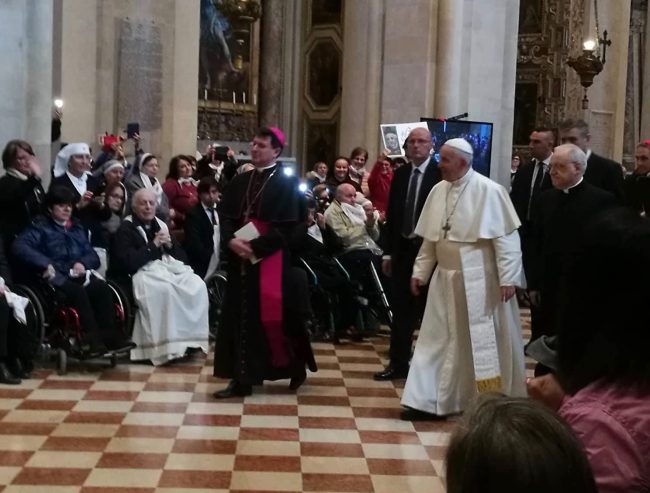 “C’è sempre lo stesso entusiasmo. Io c’ero quando venne a Loreto Giovanni XXIII e i ragazzini erano così contenti che correvano dietro alla sua auto per salutarlo – racconta Vittorio Vecchioli, titolare di un storico negozio di articoli religiosi – Sarà che eravamo tutti più giovani ma a me sembrava anche bello Giovanni XXIII. Ricordo che al termine dell’Angelus disse alla piazza: ‘… adesso vi ho dato la benedizione, andiamo tutti a pranzo e cerchiamo di essere felici in tutto…’. Queste parole mi risuonano ancora in testa come se le avessi ascoltate ieri. Poi nel 2012 ho visto da vicino papa Ratzinger mentre usciva dal suo appartamento e prima Papa Woityla. Credo però che Papa Francesco sia molto amato e per questo è seguito volentieri dalla gente”. Vecchioli ritiene che eventi eccezionali come quello di stamattina “portino benefici alla nostra città, ma anche alla nostra regione. Papa Francesco lo aspettavano da tempo: ora ha esaudito la nostra richiesta”. Un altro segno bellissimo di una Chiesa antica e immutabile nel rigore dei dogmi, ma anche giovane.