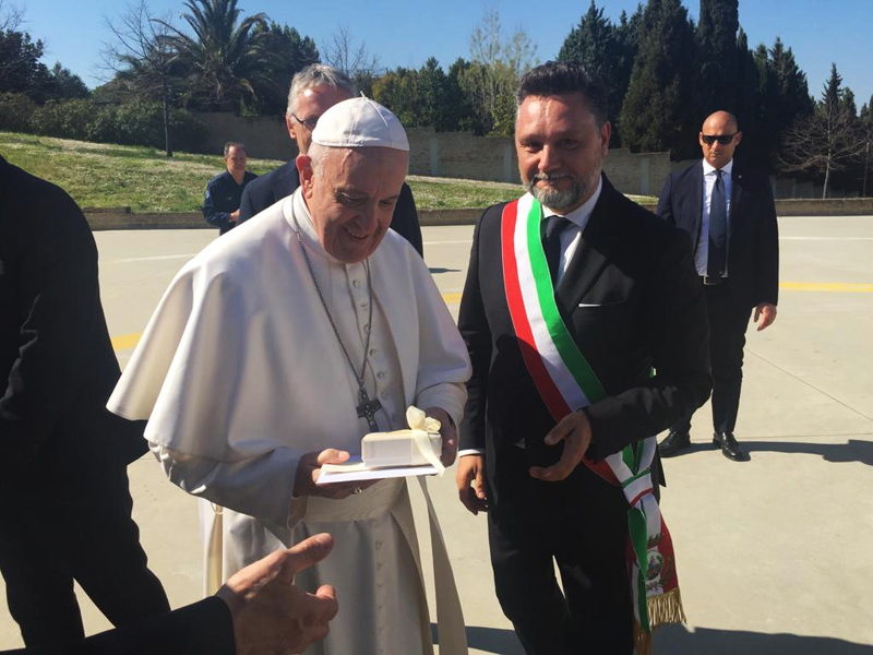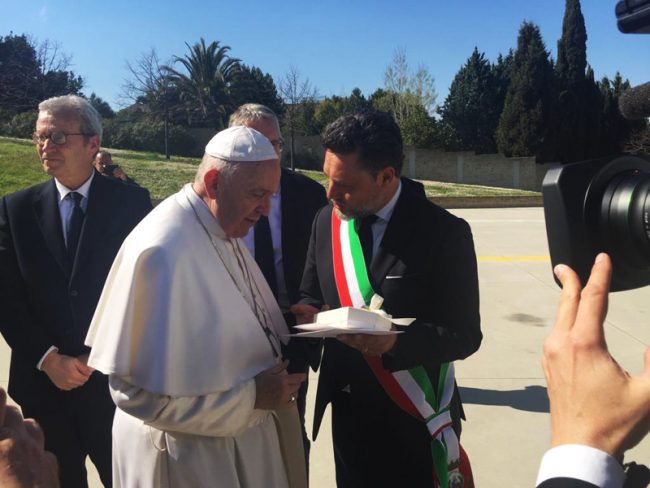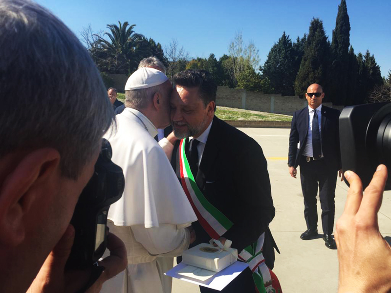 Il sindaco Paolo Niccoletti consegna il dono della città di Loreto, un rosario a Papa Francesco