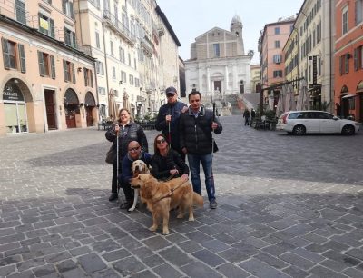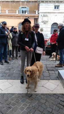“Il tempo ci ha graziato – racconta Stefania Terrè, tra le guide Uici con Italo, il suo Golden Retriever – e l’esperienza ha colto nel segno. Le persone che hanno partecipato sono state entusiaste: ‘abbiamo camminato per 40 minuti, ci è sembrato di camminare 5 ore!’ è stato il loro giudizio unanime. Prima di partire abbiamo svolto una piccola preparazione all’ascolto degli altri sensi, consigliando loro cosa fare per riconoscere vicoli, strade e piazze a occhi chiusi. Quando da una strada entri in grande piazza te ne accorgi perché l’aria che ti arriva sul viso è diversa, i rumori sono diversi, il tuo corpo percepisce uno spazio più ampio. E loro sono stati bravissimi”.