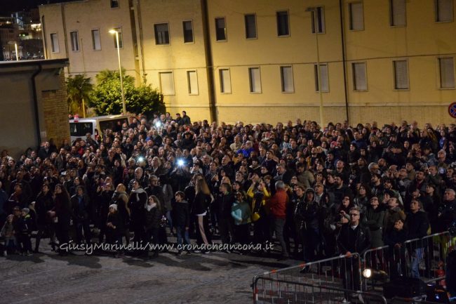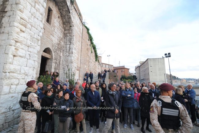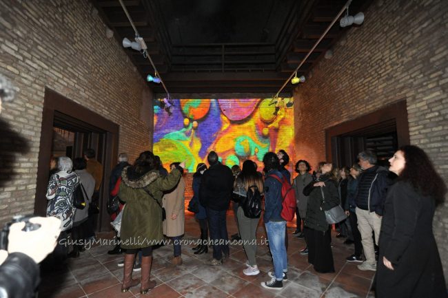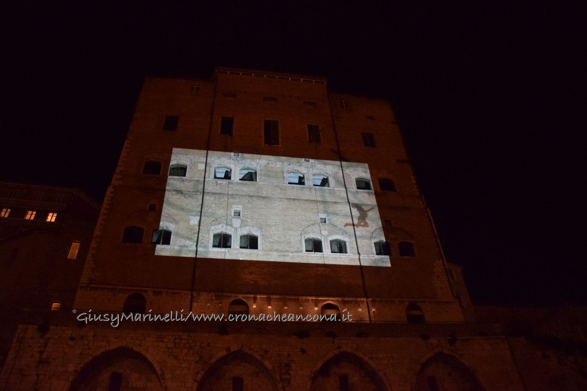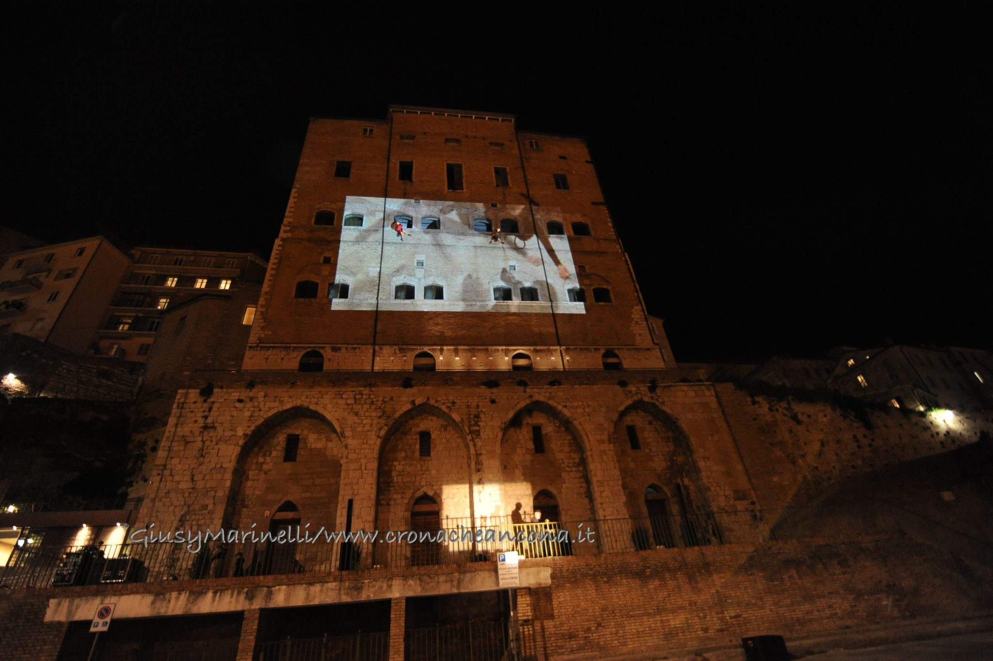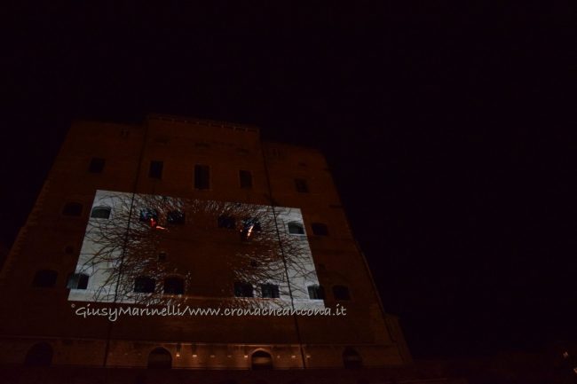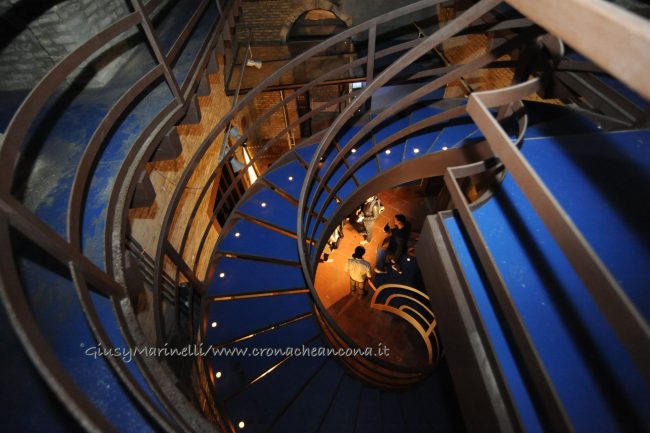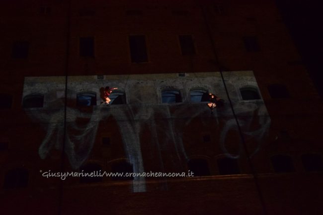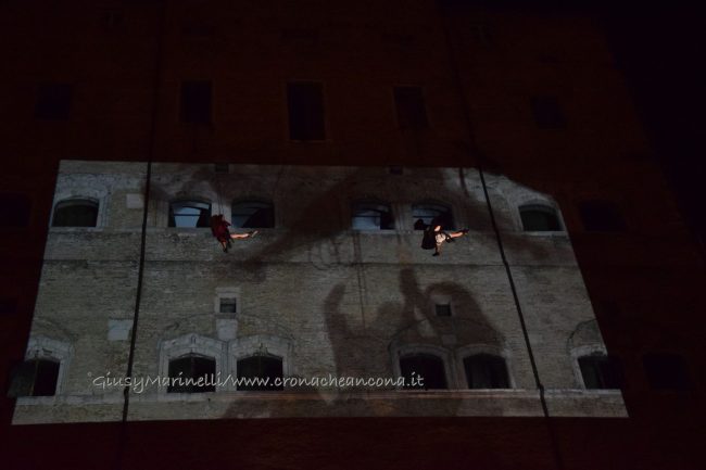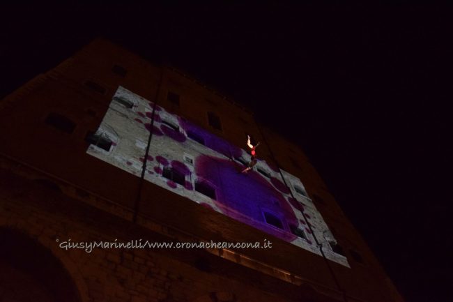 Una porta fronte mare che si spalanca sul porto e conduce al cuore della città. Inizia il nuovo corso di Palazzo degli Anziani – biglietto da visita di Ancona per i croceristi e non solo – dove oggi (7 aprile) sono state inaugurate le sale restaurate del basamento (ex magazzini), con tanto di suggestivo spettacolo di danza verticale lungo la parete del grattacielo medievale della città. Una performance con musica dal vivo e colorate proiezioni, curata della Compagnia Il Posto con direzione artistica del festival Cinematica (di cui l’evento è stato uno dei momenti clou), che ha ricevuto gli applausi della piccola folla riunitasi per vedere il primo passo del new deal per quest’area della città. Baciata dai raggi rosa del sole al tramonto riflessi sulle acque del golfo, la riapertura di quelle stanze, chiuse da tempo, è stata un’anteprima di ciò che sarà l’Urban Center, sede dello sportello turistico IAT Ancona 3.0 con percorsi multimediali hi-tech e vetrina delle bellezze e dei prodotti made in Marche, e base operativa del progetto Heritage Science, AnconArcheologica. «Il recupero di Palazzo degli Anziani – sottolinea la sindaca Valeria Mancinelli, affacciata alla terrazza che dà su piazza Dante – segna di fatto l’inizio della parte realizzativa del progetto ITI Waterfront e ne costituisce il baricentro, quale cerniera tra la città storica e il mare». A questo, si aggiungerà a breve il secondo tassello del progetto, quello dell’illuminazione dal porto su fino a via Pizzecolli, per il quale è stato già aggiudicato il concorso. Previsto anche il recupero dell’area degli ex uffici del Nautico, dove verrà realizzata una piazza, punto di sosta in direzione porto, e arriveranno anche i bus elettrici per unire il golfo alla città. «Entro il 2020, il progetto waterfront sarà concluso e darà un nuovo volto a questa parte fondamentale della città», parola della prima cittadina.