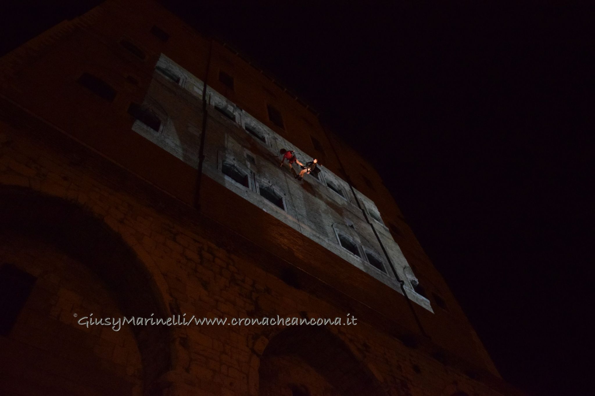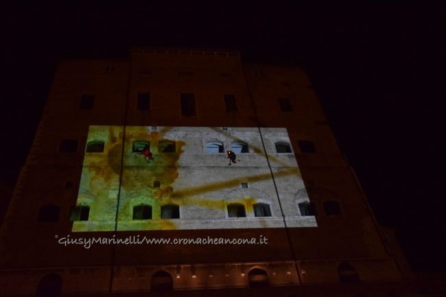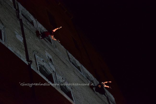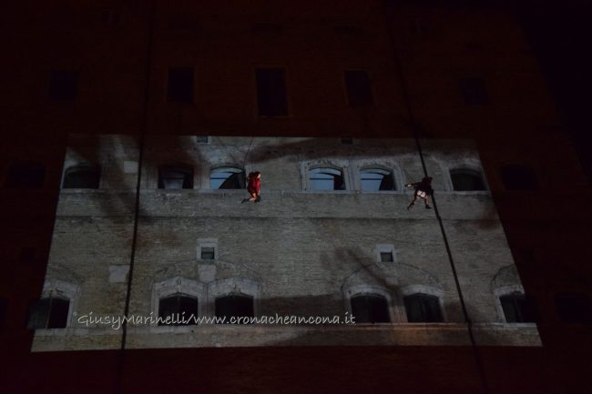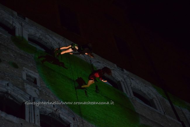 ANCONA – Show di danza verticale lungo la parete di palazzo degli Anziani, dove sono state inaugurate le sale restaurate del basamento (ex magazzini), ancora vuote, che ospiteranno l'Urban Center, sede dello sportello turistico IAT Ancona 3.0 con percorsi multimediali hi-tech, e base operativa del progetto Heritage Science, AnconArcheologica. Mancinelli: «progetto waterfront finito entro il 2020»