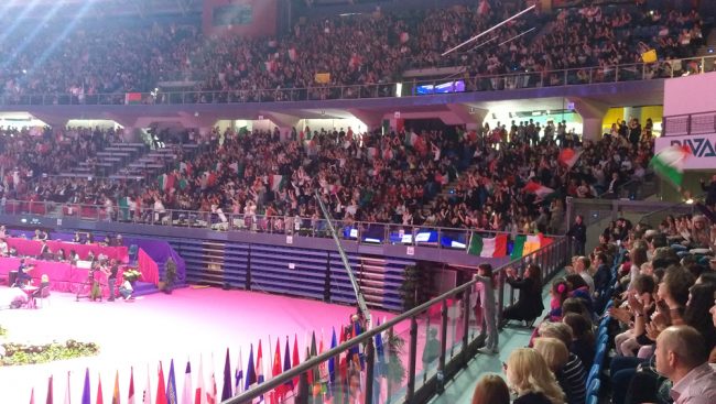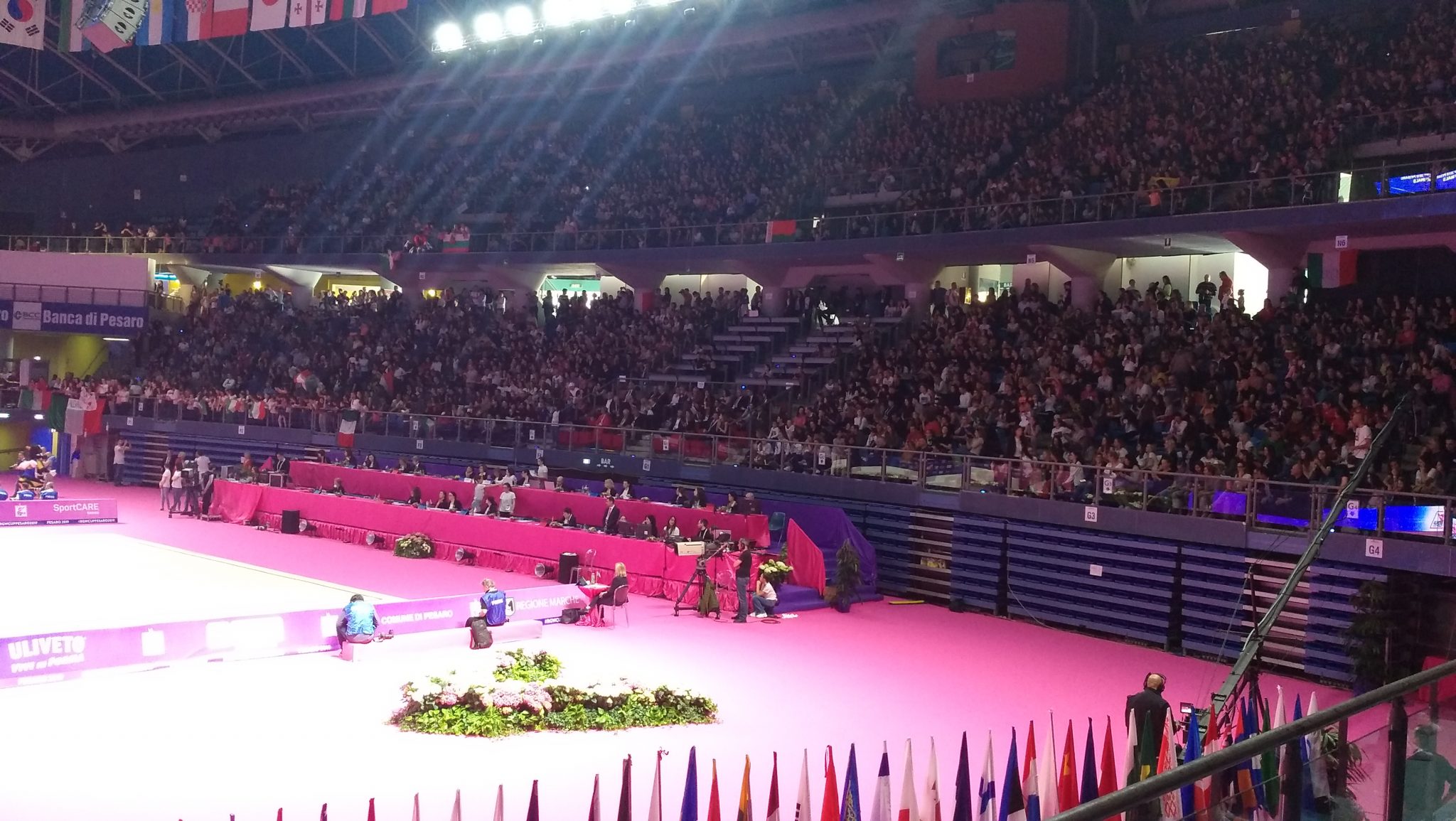 Un pubblico da record ha accompagnato la terza ed ultima giornata della World Cup di Ginnastica Ritmica “Pesaro 2019” (Vitrifrigo Arena 5-7 Aprile). Sono state oltre 5.000 le persone che hanno assistito alle finali delle Individualiste e delle Squadre. Uno spettacolo unico trasmesso in diretta televisiva su La7 dalle 14:10 alle 18:10. Riprese che hanno portato Pesaro e la Vitrifrigo Arena nelle case di tantissimi italiani. Complessivamente nell’arco dei tre giorni sono quasi 8.000 gli spettatori accorsi all’Astronave per assistere alle esibizioni delle farfalle azzurre e delle circa 180 ginnaste (74 per le gare Individuali e 105 per la gara a Squadre) che hanno preso parte alla World Cup. Un’edizione che rafforza ulteriormente il legame tra Pesaro e la ginnastica ritmica internazionale. A chiudere la manifestazione, dopo la cerimonia di premiazione, il gala di chiusura curato dalla società di ginnastica Aurora Fano a cui, in occasione dei 150 anni della Fgi (Federazione ginnastica d’Italia), hanno partecipato con le proprie coreografie anche i comitati regionali di Abruzzo, Calabria, Campania, Emilia Romagna, Lombardia, Puglia, Toscana e Veneto. Colori, musica e grandi esibizioni per concludere un’edizione della World Cup da incorniciare. I RISULTATI: