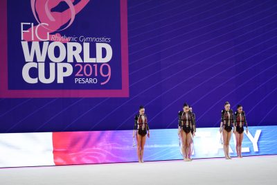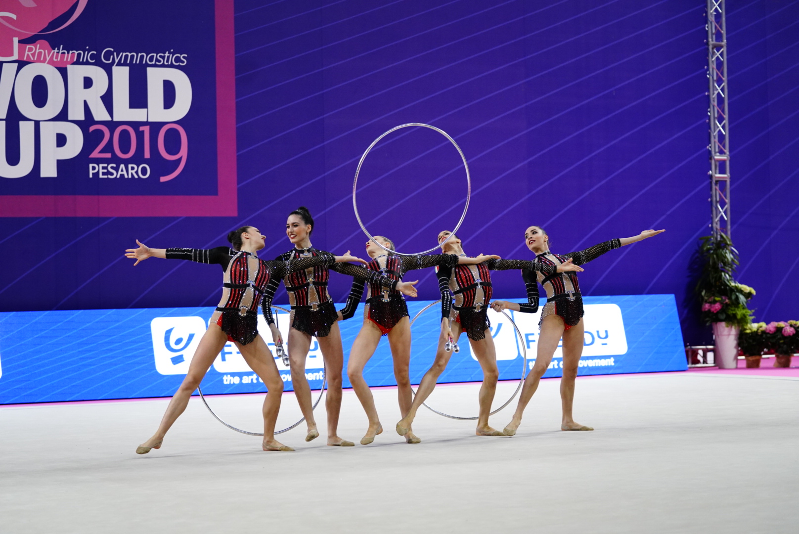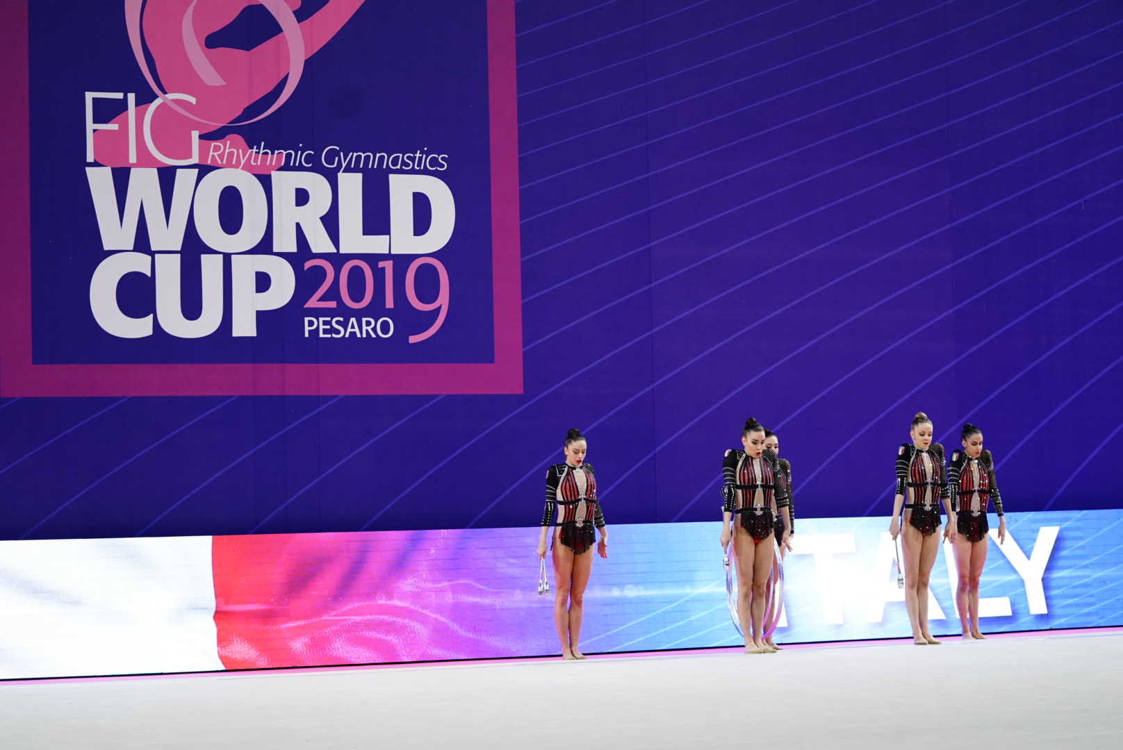 SQUADRE – Le farfalle azzurre Alessia Maurelli, Martina Centofanti (Aeronautica Militare), Agnese Duranti (Polisportiva La Fenice), Martina Santandrea (Estense Putinati), Anna Basta (Pontevecchio Bologna) e Letizia Cicconcelli (Faber Ginnastica Fabriano) hanno stregato il pubblico della Vitrifrigo Arena che le ha accolte in pedana con grande calore e affetto in un tripudio di bandiere tricolore e cori di incitamento. E le farfalle hanno ricambiato l’affetto conquistando l’oro nella finale nell’esercizio con le 5 Palle davanti a Russia e Giappone. Meno fortunate le farfalle nella finale con i Cerchi e le Clavette dove infatti si sono classificate quinte dietro a Giappone (4°), Israele (3°), Ucraina (2°) e Bulgaria (1°). <<Un’apertura di stagione molto positiva: è sempre bello ascoltare l’inno di Mameli quando la competizione si tiene in “casa”– commenta Emanuela Maccarani, direttrice tecnica della sezione di Ginnastica ritmica della Fgi nonché allenatrice delle farfalle azzurre – Eravamo in leggero ritardo di preparazione ma la forza di queste ragazze ci ha permesso di reggere a questa competizione>>.
