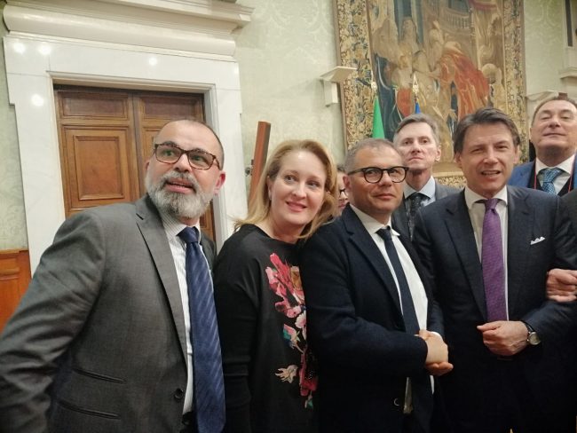 Davide da Ros (primo a destra) a Roma con l’avvocato Canafoglia (che stringe la mano al premier Conte) e la delegazioni di risparmiatori di Banca Marche