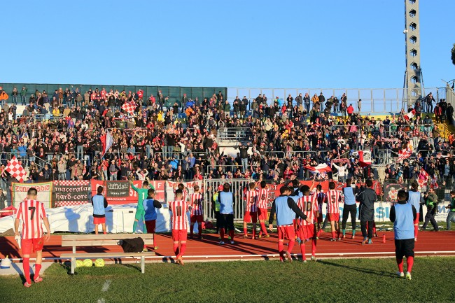 I giocatori della Maceratese salutano i propri tifosi al termine del derby vinto contro l’Ancona nel febbraio del 2016