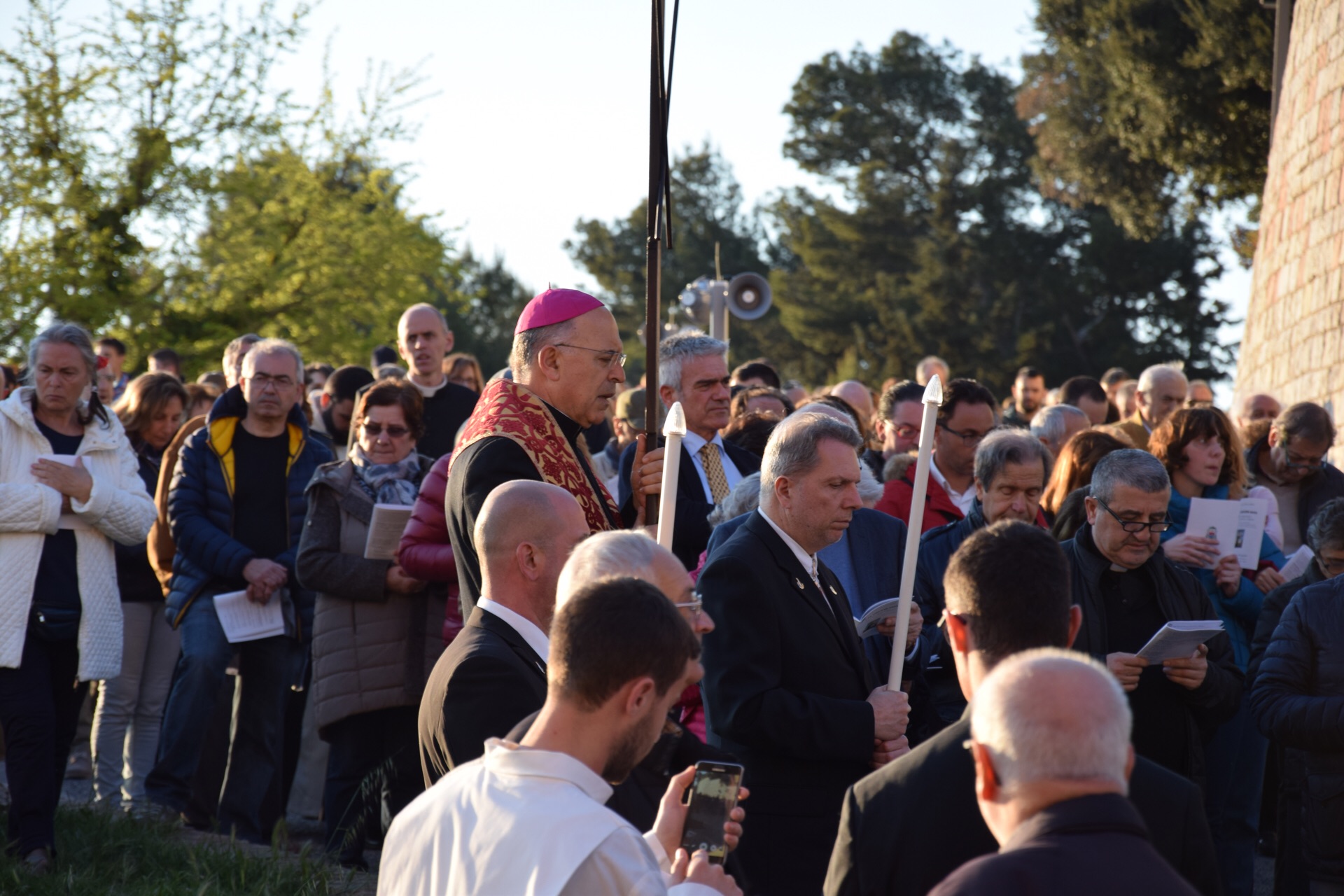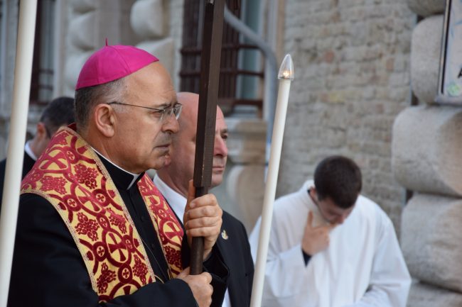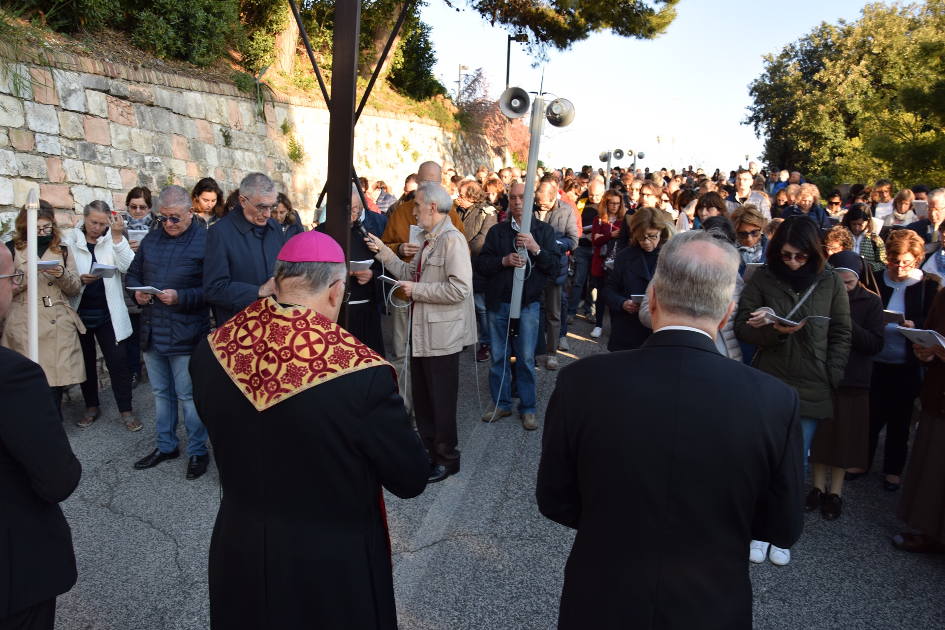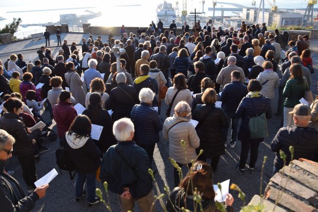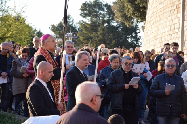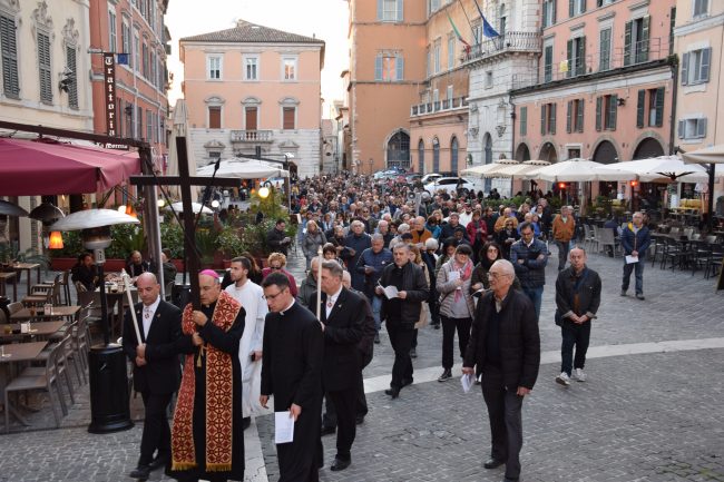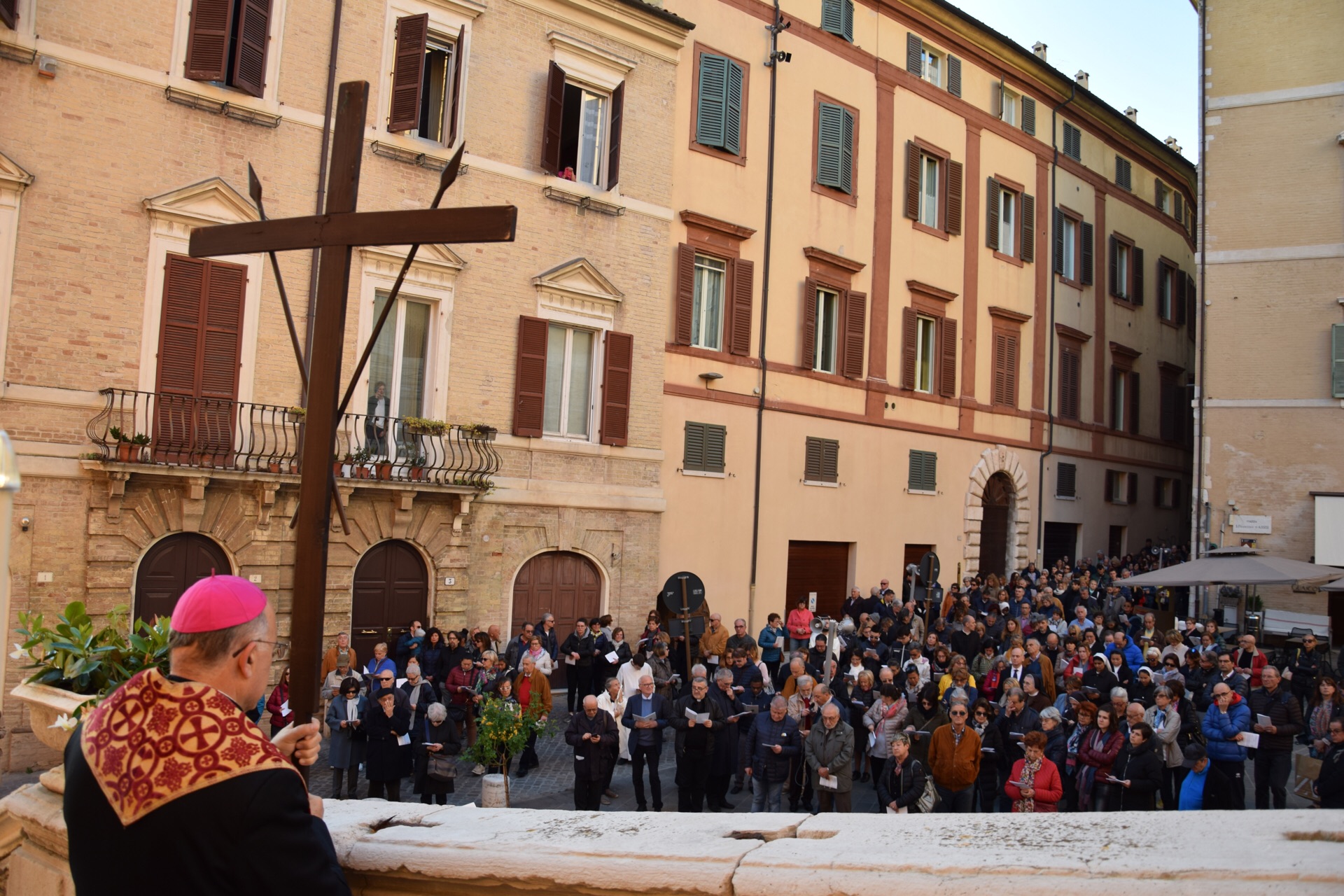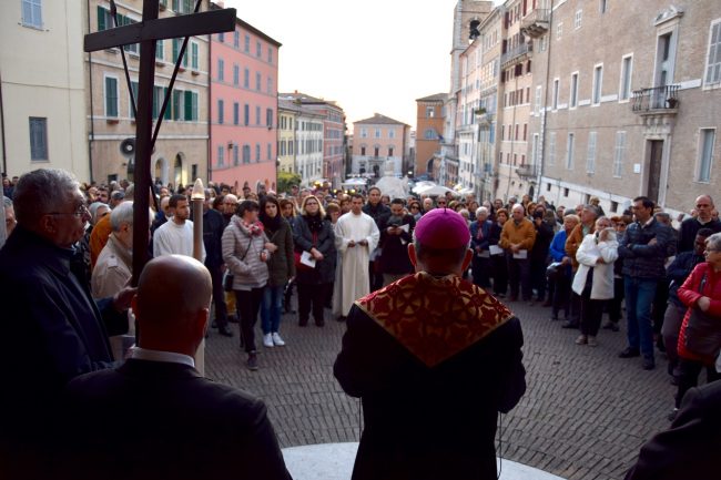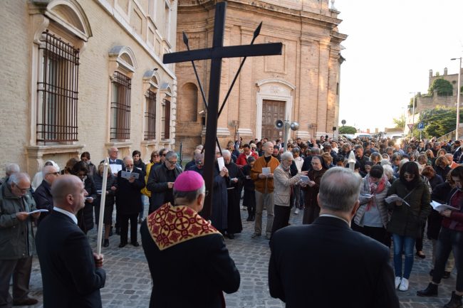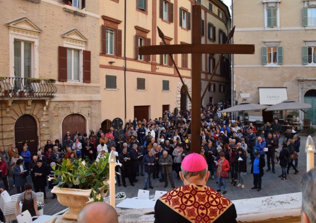 Oggi pomeriggio, a partire dalla 18.30, i fedeli anconetani hanno ripercorso le 14 stazioni della Croce, dal Duomo fino a Piazza del Papa. Le riflessioni sono state curate dai Minori Conventuali di Osimo, dalle Francescane di Cristo Re e dalle Missionarie della Carità di padre Guido, nel ricordo degli 800 anni della partenza di San Francesco da Ancona verso l’Oriente. I riti della Settimana Santa sono stati onorati in tutte le parrocchie della città: alla Sacra Famiglia, la parrocchia dei Salesiani di corso Carlo Alberto con un’altra Via Crucis, a S. Maria Liberatrice di Posatora (con partenza del corteo dalla chiesa antica fino alla chiesa di Cristo Divino Lavoratore), a S. Maria di Loreto aTavernelle, a Santa Maria delle Grazie, a San Gaspare del Bufalo a Brecce Bianche, Sacro Cuore di piazza Salvo d’Acquisto, San Giuseppe Moscati, a Santa Maria Madre di Dio di Torrette e infine alla parrocchia di Pietralacroce. L’arcivescovo Angelo Spina Spina che oggi pomeriggio ha guidato la processione. domenica celebrerà la messa di Pasqua alle 9.30 alla residenza per anziani ‘Recanatesi’ di Osimo; alle 10.30 nella cattedrale San Leopardo sempre ad Osimo ed alle 18 al duomo di San Ciriaco ad Ancona.