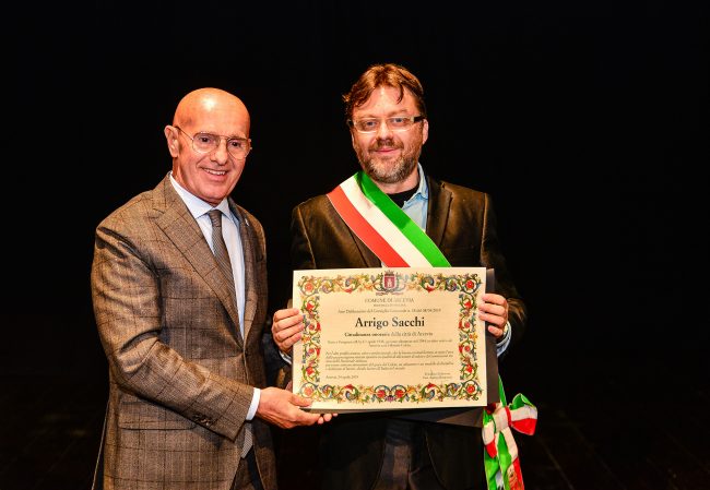 Arrigo Sacchi riceve la pergamento con il conferimento della cittadinanza onoraria dalla mani del sindaco Bomprezzi