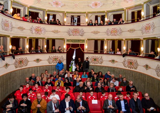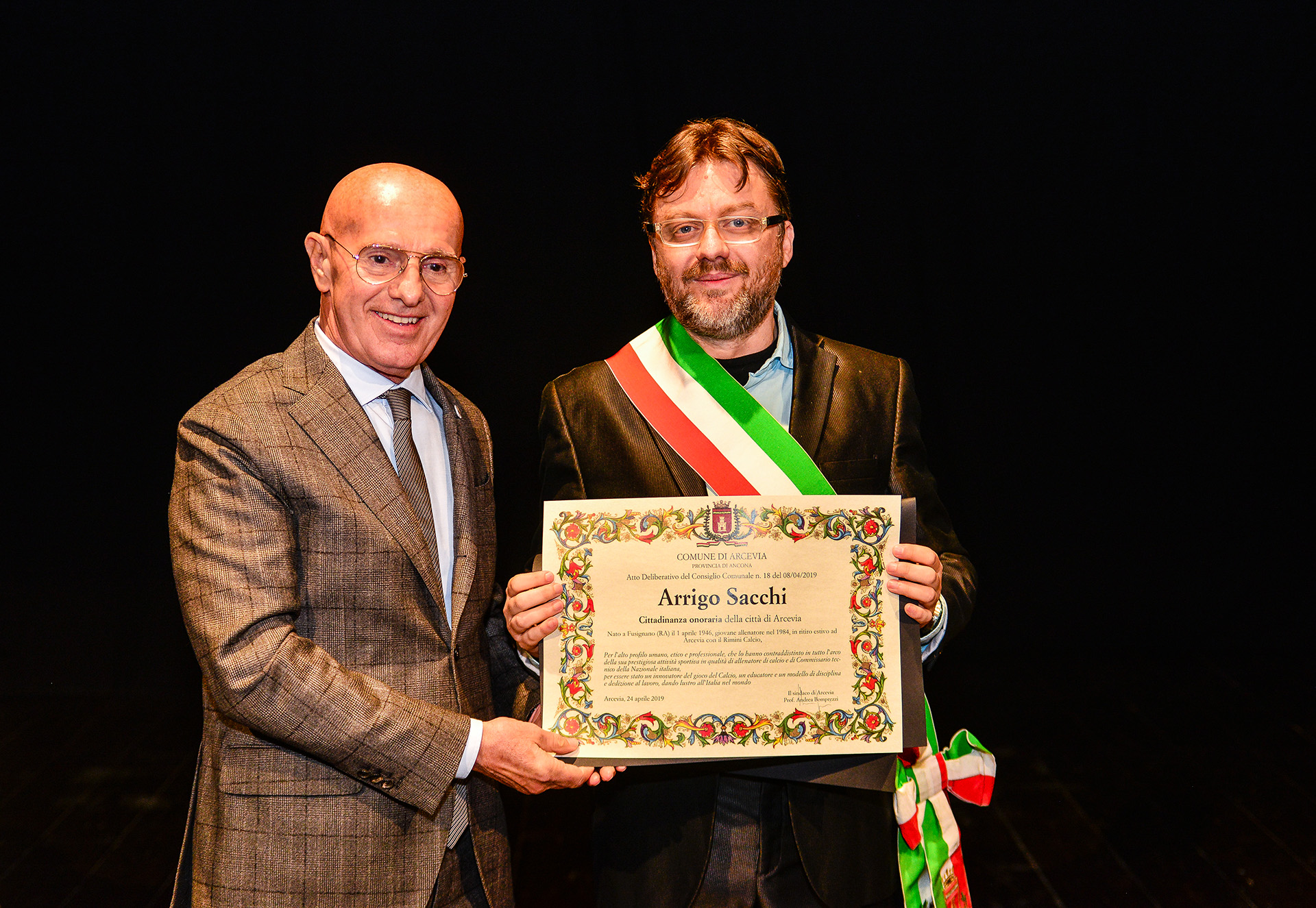 Una giornata indimenticabile, quella di ieri, 24 Aprile, per la comunità di Arcevia. Arrigo Sacchi, puntualissimo, è arrivato alle 18, accolto dal sindaco Andrea Bomprezzi e dai tanti appassionati nella sala consiliare, dove ha ricevuto un cesto di prodotti tipici locali. Poi alle 18.30, in un teatro gremito, è avvenuta l’emozionante consegna della pergamena della cittadinanza onoraria della città di Arcevia. Affabile e disponibile con tutti, come lo fu nel 1984, quando giovane allenatore venne in ritiro con il Rimini Calcio ad Arcevia, Arrigo Sacchi ha ascoltato con attenzione le parole del sindaco, quelle del giornalista Giuseppe Mennella, che ne ha tratteggiato la formidabile carriera da allenatore, quelle di Graziano Gambioli e di Augusto Battestini, testimoni del gioSacchi del 1984.