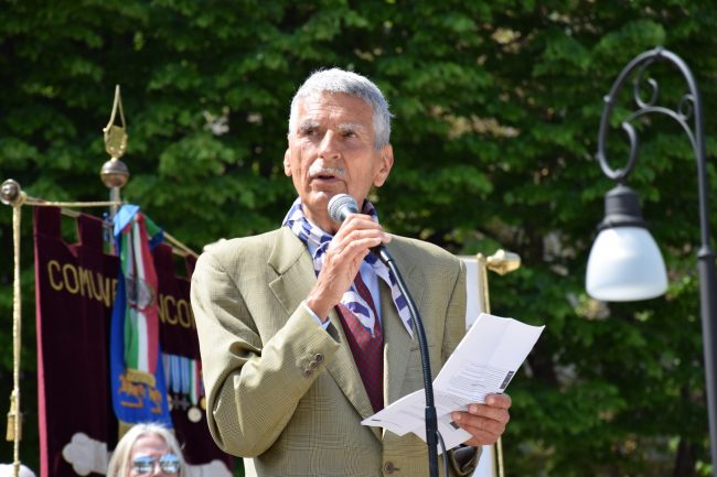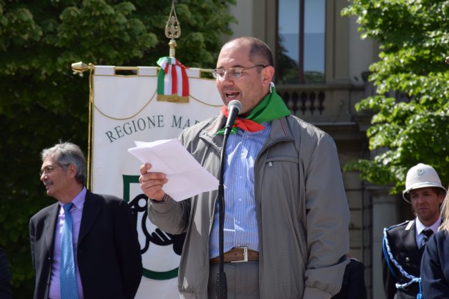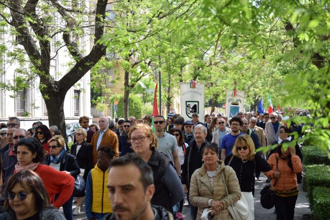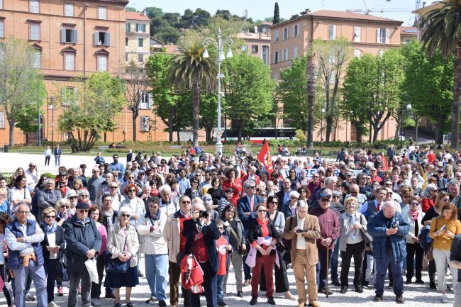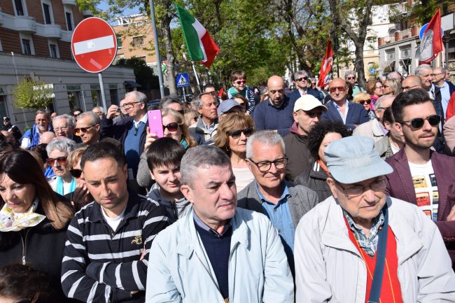 Concetto ripreso ed ampliato dal presidente di Anpi provinciale Daniele Fancello, che ha parlato anche della chiusura del punto nascita di Fabriano quale esempio di distanza delle istituzioni dai problemi dei cittadini, dell’antipolitica come cavallo di Troia per «questo clima sovranista» e non ha lesinato neanche lui una stoccata a Salvini, ricordando «la foto di Pasqua con il mitra» e puntualizzando che «la mafia va combattuta ogni giorno, non solo il 25 aprile», alludendo alla scelta del ministro di andare proprio oggi a Corleone. A chiudere il tris di interventi, Guido Lorenzetti, presidente dell’Associazione nazionale ex deportati, figlio di quell’Andrea Lorenzetti a cui è stata anche dedicata una pietra d’inciampo proprio quest’anno: «volendo utilizzare lo stesso linguaggio rozzo, la Festa della Liberazione non è un derby tra comunisti e fascisti, caro ministro, ma nel caso tra oppressione e democrazia».