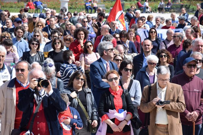 Quest’anno, le celebrazioni per il 25 aprile, sono state più sentite del solito. A sfilare in corteo lungo il viale della Vittoria, dal monumento dei Caduti del Passetto, fino a piazza Cavour, accompagnati dalla banda di Torrette, c’erano più persone dello scorso anno e forse la ragione è quella scandita dalla sindaca Valeria Mancinelli dal palco all’ombra del conte Camillo Benso.