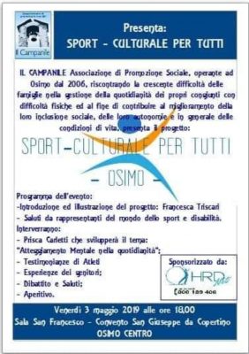 ‘Il Campanile’ di Osimo organizza per il prossimo 3 maggio, nella sala S. Francesco del convento di San Giuseppe Da Copertino di Osimo un evento-incontro dal tema “Sport – culturale per tutti”. L’associazione di promozione sociale opera sul territorio osimano dal 2006 con lo scopo di sostenere, aiutare nella quotidianità, attraverso iniziative come questa le famiglie nella gestione dei propri cari delle difficoltà quotidiane relative alla disabilità , cercando di migliorare la loro condizione, nell’inclusione sociale, nella propria autonomia, in una generale prospettiva di miglioramento della loro condizione di vita. Il programma dell’evento prevede in apertura i saluti del presidente de ‘Il Campanile’ Roberto Pirani e a seguire Francesca Triscari, tra i fondatori dell’associazione, introdurrà e illustrerà progetto. Sarà poi la volta dei saluti da rappresentanti del mondo dello Sport e disabilità.