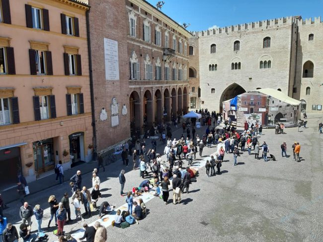 Il maxi acquarello dipinto sul rotolo di carta steso sul selciato della piazza principale di Fabriano