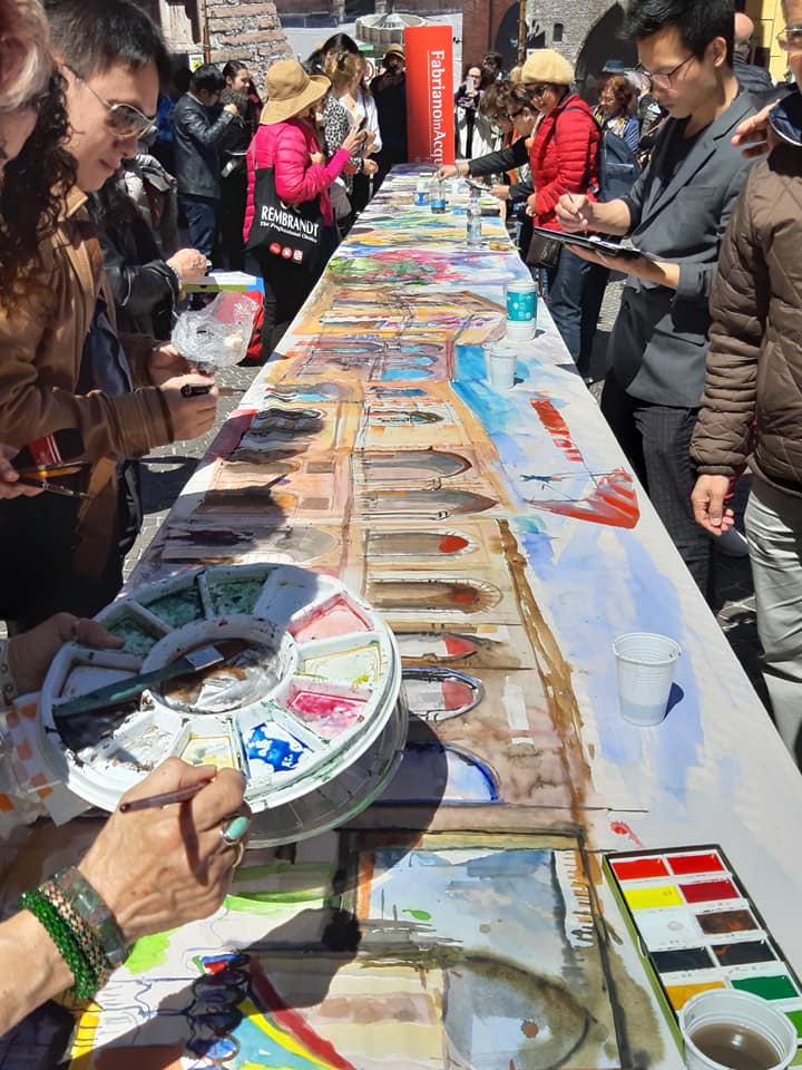 ARTE- L'opera d'arte realizzata, nell'ambito del festival FabrianoInAcquarello, su 100 metri di carta srotolata sul selciato della piazza principale e arricchita di dettagli dalle mani sapienti di artisti arrivati da tutto il mondo