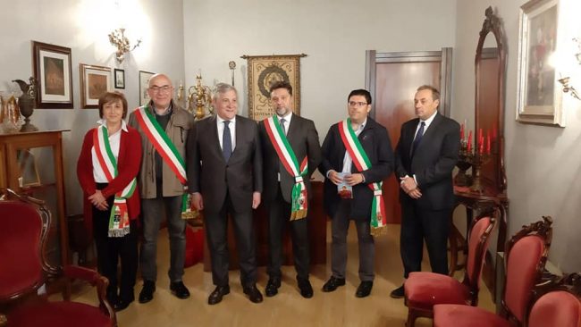 Antonio Tajani con i sindaci della Via Lauretana, opsiti del primo cittadino di Loreto, Paolo Niccoletti (al centro)