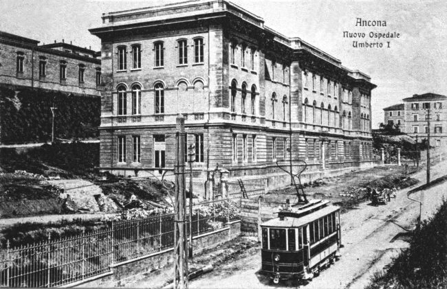 Il complesso ospedaliero e per poveri di S.Anna – S.S. Trinità, sorto nel convento poi ristrutturato che da decenni ospita la sede dei laboratori scientifici e di ricerca dell’Inrca, dietro i pochi resti, in via Birarelli della chiesa di Sant’Anna de’ Greci (distrutta dai bombardamenti della seconda guerra mondiale) può essere considerato il primo antenato storico dell’Umberto I. Le targhe del greco Maurodini furono traslate nei primi decenni del XXIX secolo in un ospedale religioso più grande ed efficiente, approntato nel 1817, in un altro convento, quello di San Francesco alle Scale, retto dall’ordine dei Fatebenefratelli di Ancona. Nello stesso ospedale fu spostata la targa di Giuseppe Berardi (anche questa presente nell’androne dell’ex Umberto I), cui va il merito di aver donato un lascito nel 1802 ad un altro piccolo nosocomio, riservato alle inferme. Sempre “leggendo” le pareti dell’atrio dell’ex Umberto I, la storia ci riporta all’ospedale conventuale di San Francecso alle Scale: due lapidi omaggiano padre Benedetto Vernò, priore del citato ordine dei Fatebenefratelli (dal 1837 al 1850), fondatore di un reparto per i malati di mente, inaugurato nel 1840 col nome di Ospizio di San Giovanni di Dio; un’altra è un tributo al marchese Giovanni Ruffini, che “nel luglio del 1822 fece erede del ricco suo patrimonio questo ospedale (quello di San Francesco alle Scale, ndr.)”.