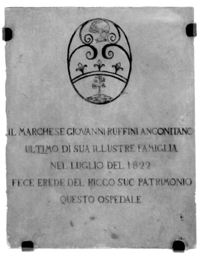 Il complesso ospedaliero e per poveri di S.Anna – S.S. Trinità, sorto nel convento poi ristrutturato che da decenni ospita la sede dei laboratori scientifici e di ricerca dell’Inrca, dietro i pochi resti, in via Birarelli della chiesa di Sant’Anna de’ Greci (distrutta dai bombardamenti della seconda guerra mondiale) può essere considerato il primo antenato storico dell’Umberto I. Le targhe del greco Maurodini furono traslate nei primi decenni del XXIX secolo in un ospedale religioso più grande ed efficiente, approntato nel 1817, in un altro convento, quello di San Francesco alle Scale, retto dall’ordine dei Fatebenefratelli di Ancona. Nello stesso ospedale fu spostata la targa di Giuseppe Berardi (anche questa presente nell’androne dell’ex Umberto I), cui va il merito di aver donato un lascito nel 1802 ad un altro piccolo nosocomio, riservato alle inferme. Sempre “leggendo” le pareti dell’atrio dell’ex Umberto I, la storia ci riporta all’ospedale conventuale di San Francecso alle Scale: due lapidi omaggiano padre Benedetto Vernò, priore del citato ordine dei Fatebenefratelli (dal 1837 al 1850), fondatore di un reparto per i malati di mente, inaugurato nel 1840 col nome di Ospizio di San Giovanni di Dio; un’altra è un tributo al marchese Giovanni Ruffini, che “nel luglio del 1822 fece erede del ricco suo patrimonio questo ospedale (quello di San Francesco alle Scale, ndr.)”.