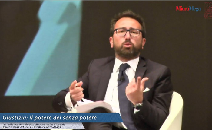 In un veloce excursus storico il direttore di Micromega ha ricordato l’epoca di Mani Pulite, per poi analizzare il caos politico che vive oggi l’Italia «Se la politica avesse assunto l’impegno di proseguire nell’esempio dei magistrati in prima linea nella lotta alla mafia, oggi avrebbe un’Europa completamente diversa. Invece in questi 27 anni la politica ha fatto di tutto sul piano legislativo e mediatico per rendere sempre più difficile l’opera dei magistrati e delle forze dell’ordine e di tutto ciò che significa l’impegno per la legalita – ha osservato il giornalista – Pagare le tasse e non avere criminalità organizzata dovrebbe essere il minimo. Questo permetterebbe al nostro Paese di non dover affrontare manovre finanziarie ‘lacrime e sangue’ e di ridurre le tasse. I soldi ci sono ma corruzione ed evasione sono i 2 grandi serbatoi di risorse sottratte ai cittadini». Poi ha passato in rassegna quello che in questi 10 mesi di governo è stato riformato sul piano della giustizia a partire dalla questione della prescrizione, non del tutto applicata pero. Si poteva fare di più, in linea con il principio che è il valore principe del M5S? Ha domandato al guardasigilli.