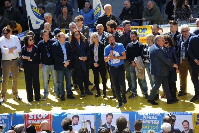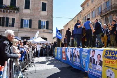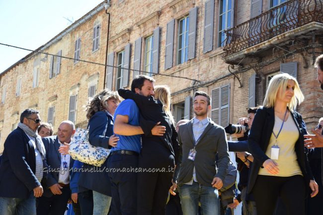 Ha solo 27 anni il candidato sindaco di Osimo scelto dalla Lega. Ma per Matteo Salvini, Alberto Maria Alessandrini otterrà un ottimo risultato elettorale alle Comunali del prossimo 26 Maggio «perché noi ci mettiamo la faccia, con coerenza. Altri si travestono, ma non siamo mica al carnevale di Fano. Noi siamo la Lega poi c’è qualcuno che è di destra e fa finta di essere di sinistra e qualcuno di sinistra fa finta di essere di destra». Il leader leghista si è soffermato a parlare con i giornalisti a margine del comizio tenuto oggi pomeriggio in piazza del Comune, accennando anche alla situazione politica osimana, frantmata in un universo di liste civiche e ai grandi temi marchigiani, dalla sanità a Banca Marche. «Noi abbiamo l’orgoglio – ha rimarcato- un simbolo, una storia, i governatori più amati d’Italia, Zaia, Fontana e Fedriga. Spero davvero di vedere dalla prossima settimana tanti sindaci in più su cui contare. Poi è ovvio che da ministro dell’Interno rispondo a tutti i sindaci: invio militari e poliziotti, accendo telecamere ovunque a prescindere dai colori politici. Spero che le Marche guardino avanti».