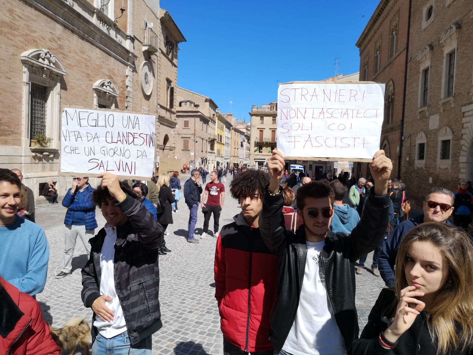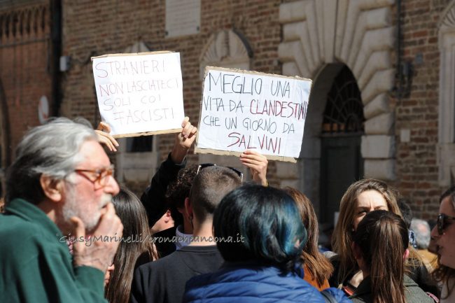 E’ iniziata con le contestazioni di una cinquantina di manifestanti la visita di Matteo Salvini a Osimo. Ed è proseguita con una sorta di siparietto. A chi cantava “Bella Ciao”, dandogli del fascista e del buffone, il leader della Lega ha risposto: «Sento dei moscerini, là in fondo per loro servirebbero meno canne e più uovo sbattuto della nonna. L’unica cosa che mi dispiace e che ci siano donne e uomini della polizia occupati a tenerli a bada invece di andare ad arrestare spacciatori e delinquenti. Cercano i fascisti ma qui non ci sono fascisti, ci sono solo italiani orgogliosi di essere italiani. Cercano i razzisti ma qui non ci sono. Cercano gli alieni, i venusiani…». Dopo il siparietto con i contestatori, è iniziato il comizio, durato poco più di un quarto d’ora, e sempre interpuntato da controbattute in risposta a chi contestava. Una piazza divisa in due da un cordone di poliziotti in tenuta antisommossa che gridava in stereofonia. Da una parte applausi, dall’altra fischi. Circa 2500 sostenitori, secondo la questura, una cinquantina di manifestanti e un gran spiegamento di forze dell’ordine. Matteo Salvini è arrivato ad Osimo poco dopo le 14, per l’atteso comizio in piazza del Comune a sostegno del candidato sindaco Alberto Maria Alessandrini. Un cordone di agenti in assetto antisommossa a dividere i sostenitori ai piedi del palco dai contestatori poco più dietro.
