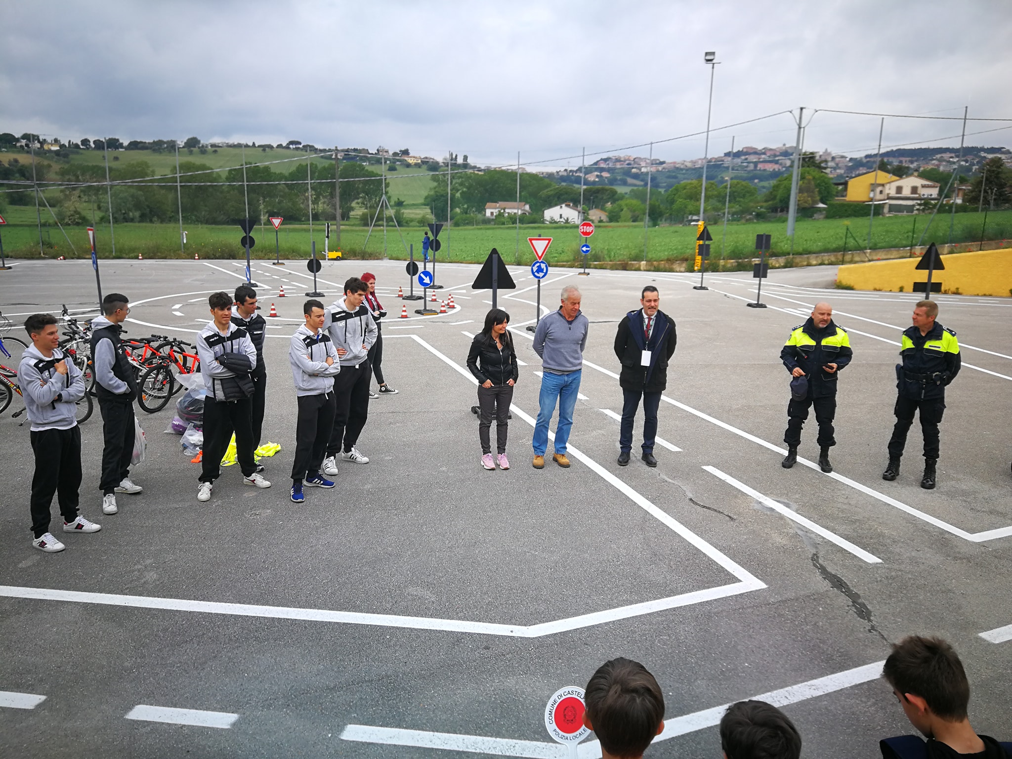 Gradita sorpresa, stamattina, per gli studenti di Castelfidardo alle prese con la lezione pratica di guida e sicurezza stradale sulla pista didattica intitolata al compianto campione di ciclismo Michele Scarponi. «Prima di partire per la Due Giorni Marchigiana abbiamo portato una squadra umbra a vedere la nostra pista didattica. – spiega il sindaco Roberto Ascani – Con nostra enorme soddisfazione, il direttore sportivo nonostante la sua grande esperienza anche al nord Italia ci ha riferito che é la prima volta vede una pista del genere e si è complimentato per l’iniziativa. I ragazzi delle nostre scuole nel frattempo hanno imparato a riconoscere i segnali, le regole basilari per la sicurezza e si sono persino calati nella onorevole attività di Forza dell’ordine. Muniti di paletta e giubbotto antiproiettile hanno gestito il traffico e richiesto i documenti ai veicoli che transitavano. Un grande ringraziamento alla Polizia Municipale e alla Superbike team per il loro prezioso supporto».