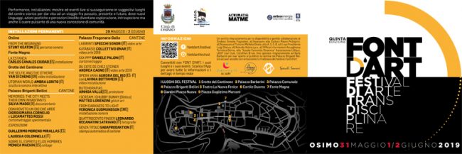 Decine di interpreti del nostro tempo, nazionali e internazionali, riflessi e prospettive che, per la prima volta, declineranno al plurale lo spazio reale e simbolico di una città. Tutto questo è Font d’Art, festival di arte contemporanea transdisciplinare, di scena dal 31 maggio al 2 giugno, per una quinta edizione completamente rinnovata grazie anche all’impegno dell’amministrazione Comunale e dell’associazione che organizza la rassegna e le dà il nome guidata da Monica Ficosecco. Tre giorni densi di installazioni, performances, concerti, incontri ed esposizioni disseminati per i luoghi più suggestivi del centro storico di Osimo alcuni dei quali normalmente chiusi al pubblico e svelati per l’occasione.